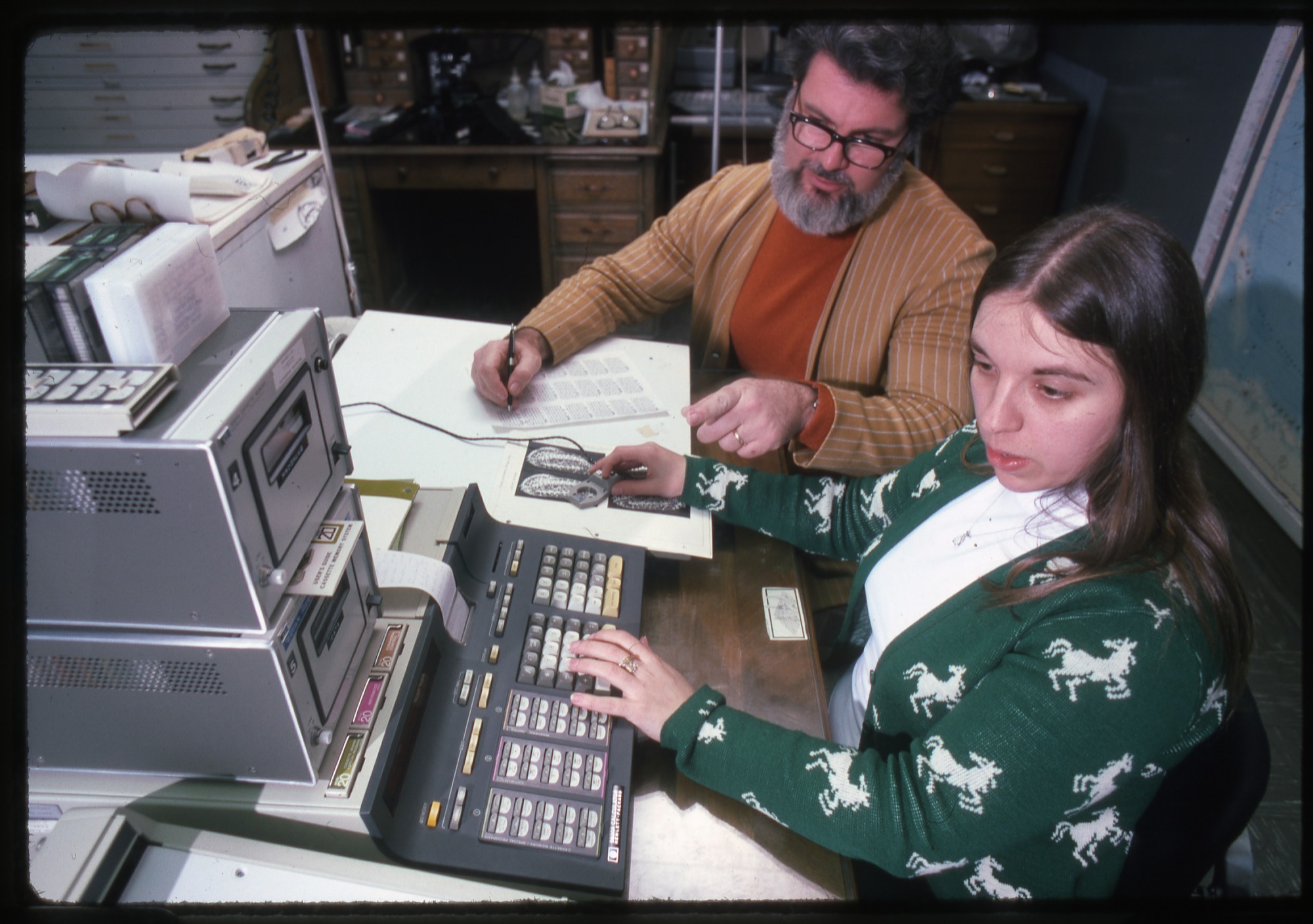 Richard H. Benson (1929-2003), 1964-1978, curator at the National Museum of Natural History, Department of Paleobiology, is seated next to a desk as he watches a woman input data.