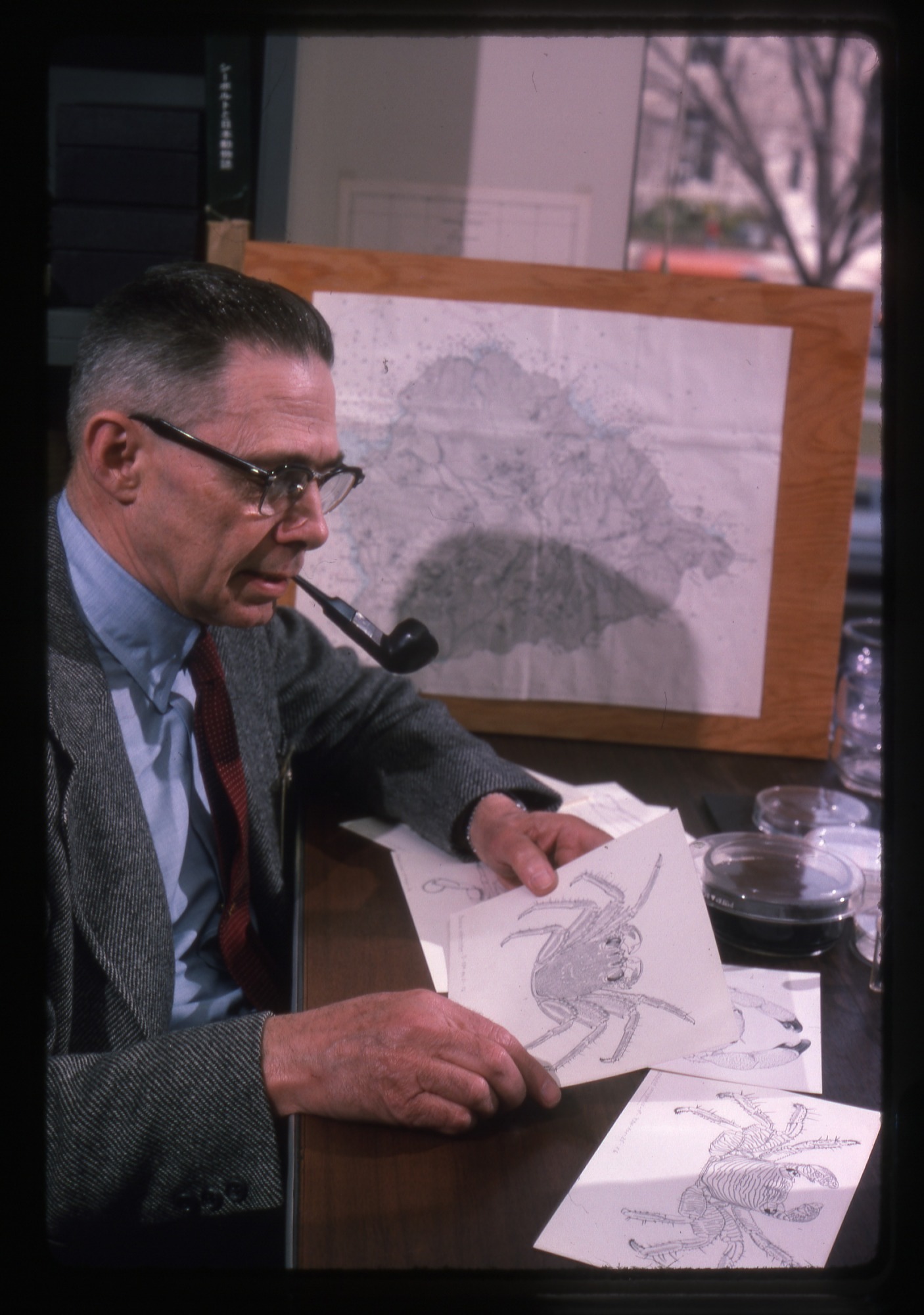 Fenner A. Chace, Jr., (1908-2004), carcinologist and a senior zoologist research scientist, Department of Invertebrate Zoology, National Museum of Natural History, sits at a desk with a pipe in his mouth holding an illustration of an invertebrate. Other illustrations lie on the table. A map of an island leans against a wall. Chace specialized in the taxonomy, morphology, and distribution of decapod Crustacea.