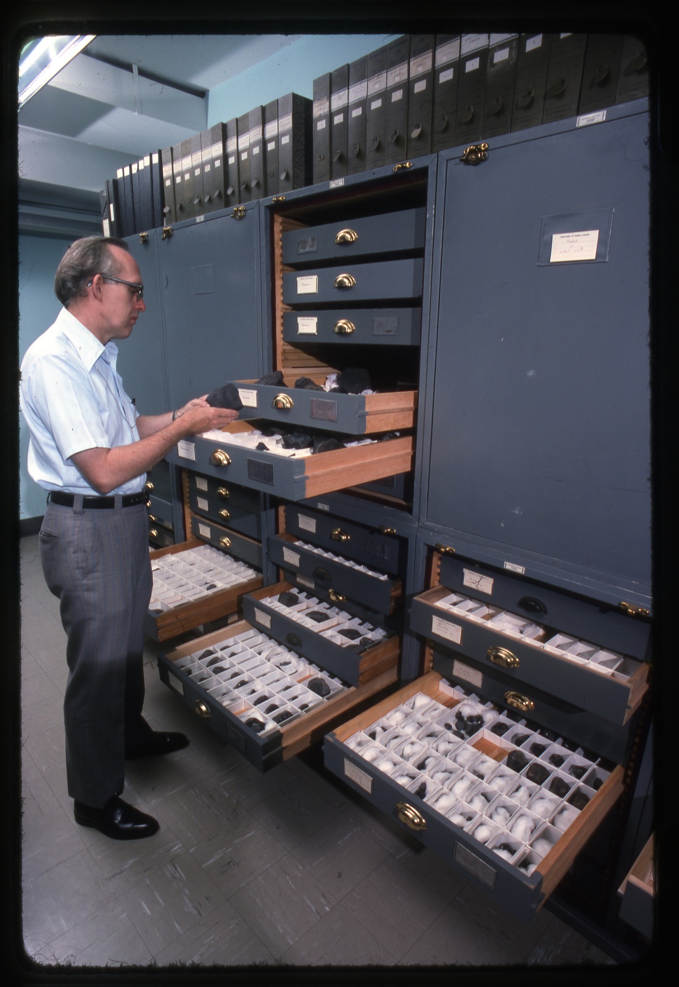 Dr. Roy S. Clarke, Jr., curator of the Smithsonian's National Museum of Natural History meteorite collection, stands at collection storage units holding meteorite specimens. Several drawers are open displaying specimens and Clarke holds a specimen in his hands.