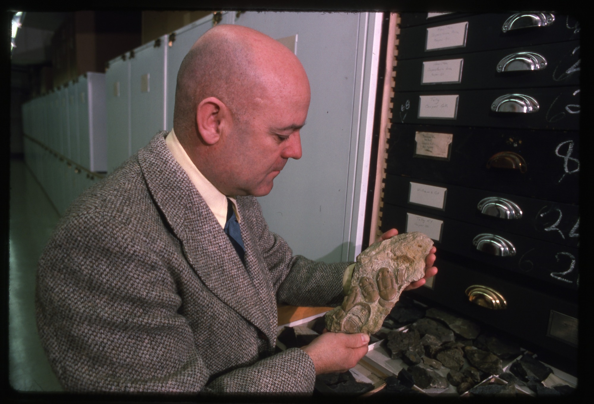 Fred (Frederick J.) Collier, Collection Manager in the Department of Paleobiology, National Museum of Natural History, holds a fossil, with preserved remains or traces of an animal, plant, or other organism, found in rock formations and sedimentary layers. Other specimens can be seen in an open drawer.