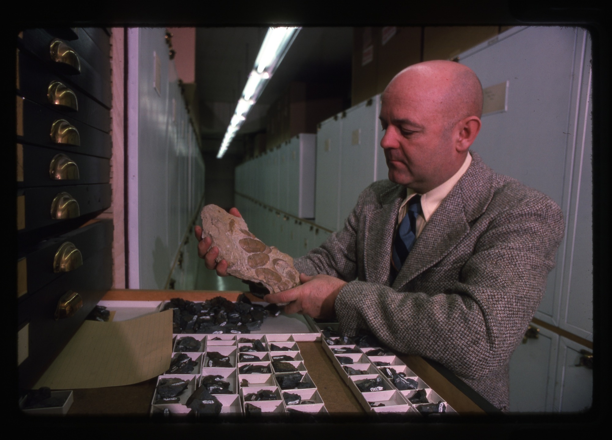 Standing in front of an open drawer holding fossil specimens, Fred (Frederick J.) Collier, Collection Manager in the Department of Paleobiology, National Museum of Natural History, holds a fossil, preserved remains or traces of an animal, plant, and other organism found in rock formations and sedimentary layers.