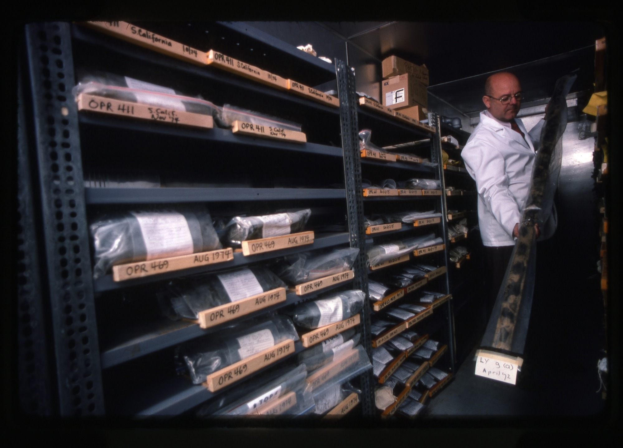 In the Paleo collection, Fred (Frederick J.) Collier, Collection Manager in the Department of Paleobiology, National Museum of Natural History, stands holding a core segment labeled "LF g(a) April '72." Other objects (core segments) wrapped in plastic are on open shelving with labels on each shelf.