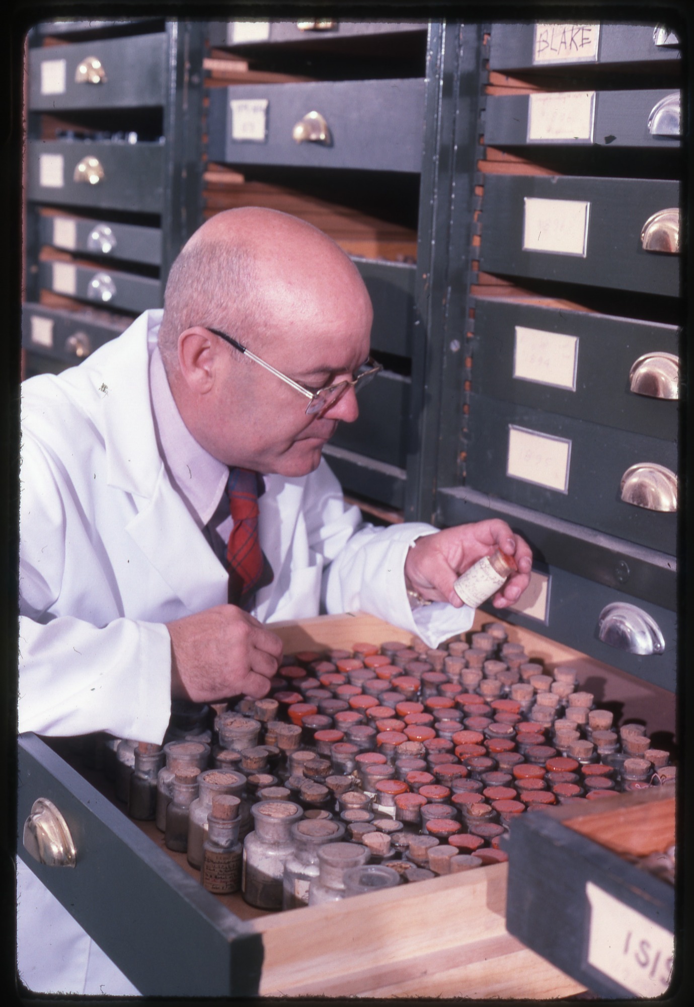 In the Paleobiology collection at an open drawer holding specimen bottles, Fred (Frederick J.) Collier, Collection Manager in the Department of Paleobiology, National Museum of Natural History, stands holding a bottle in his left hand.