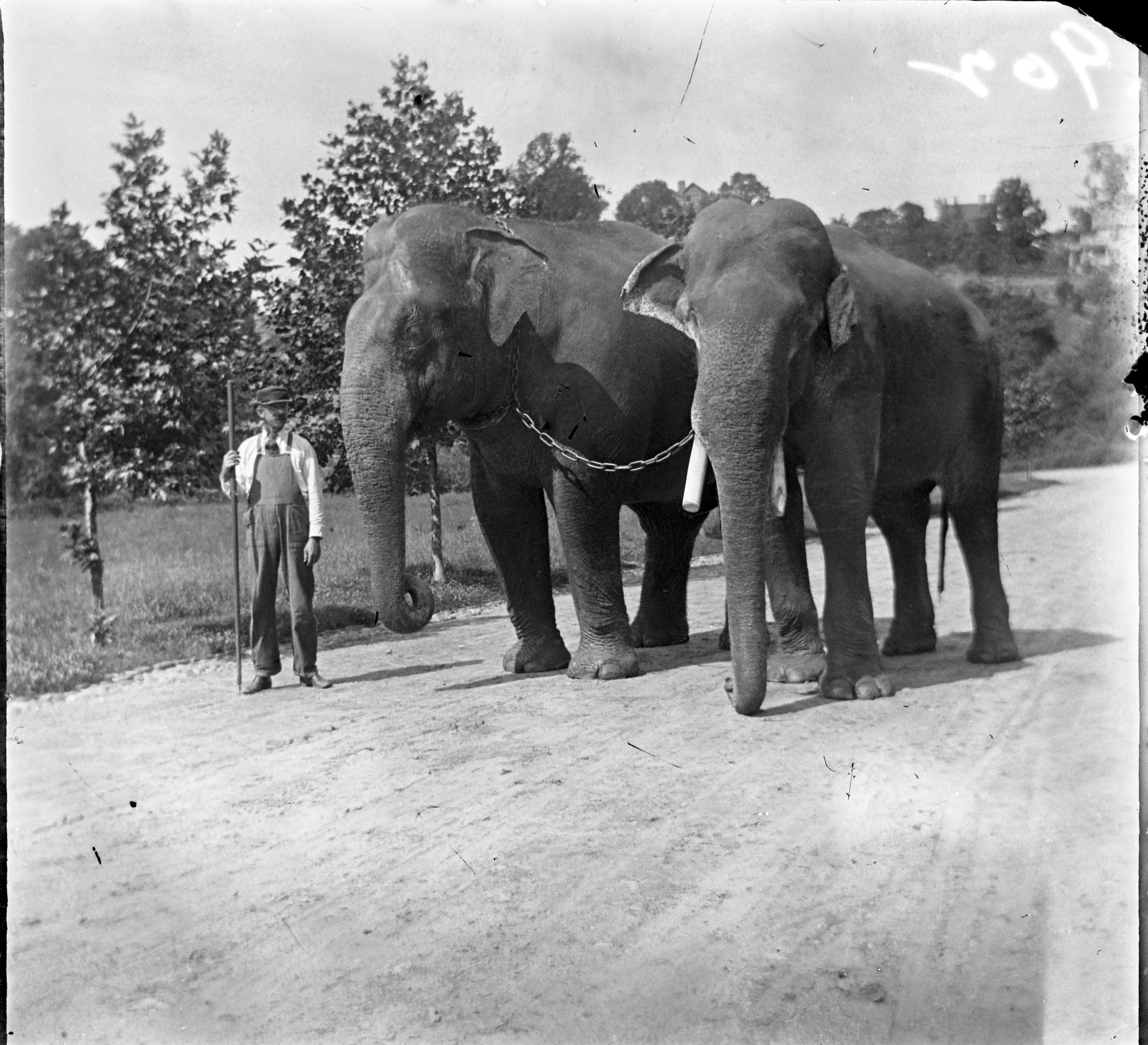 Dunk (right) and Gold Dust (left), the National Zoological Park's first elephants, take a walk with one of the zoo's keepers, William Blackburne.