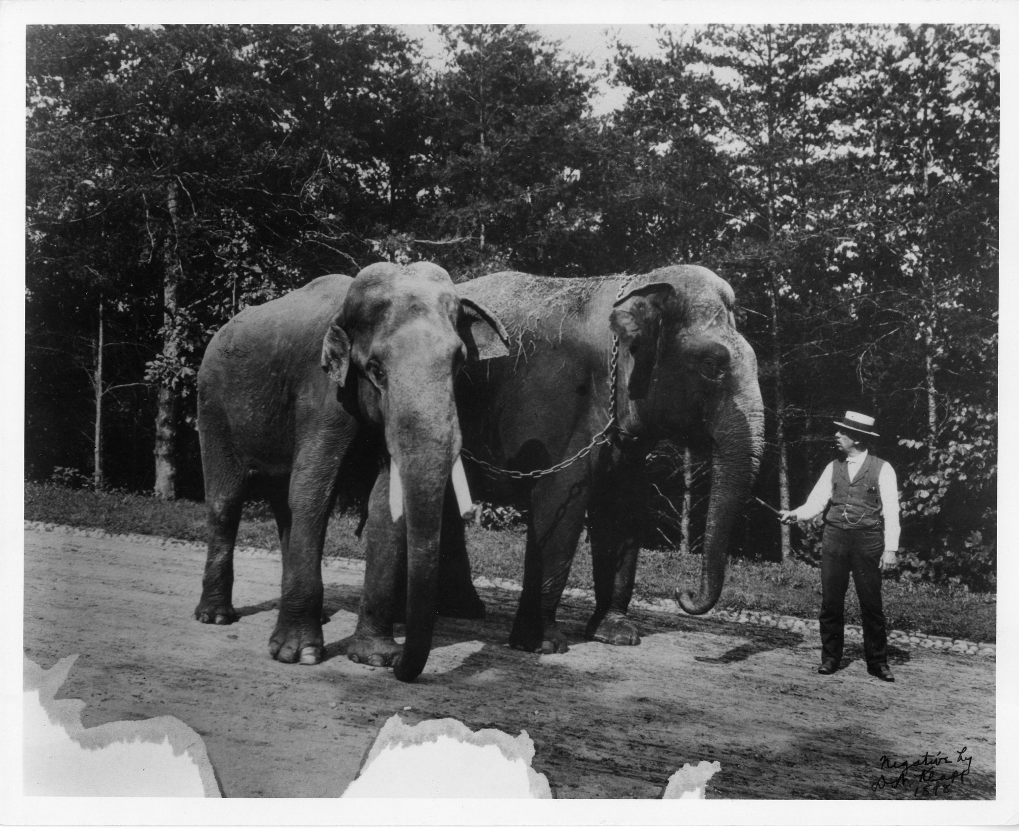 William Blackburne, keeper at the National Zoological Park leads the zoo's first elephants Dunk (right) and Gold Dust (left), who are tied together with a chain. Blackburne has a lead stick in his hand. There is a inscription in the bottom right corner that reads: "Negative by D A Klapp 1898." The bottom of the images has some wear.