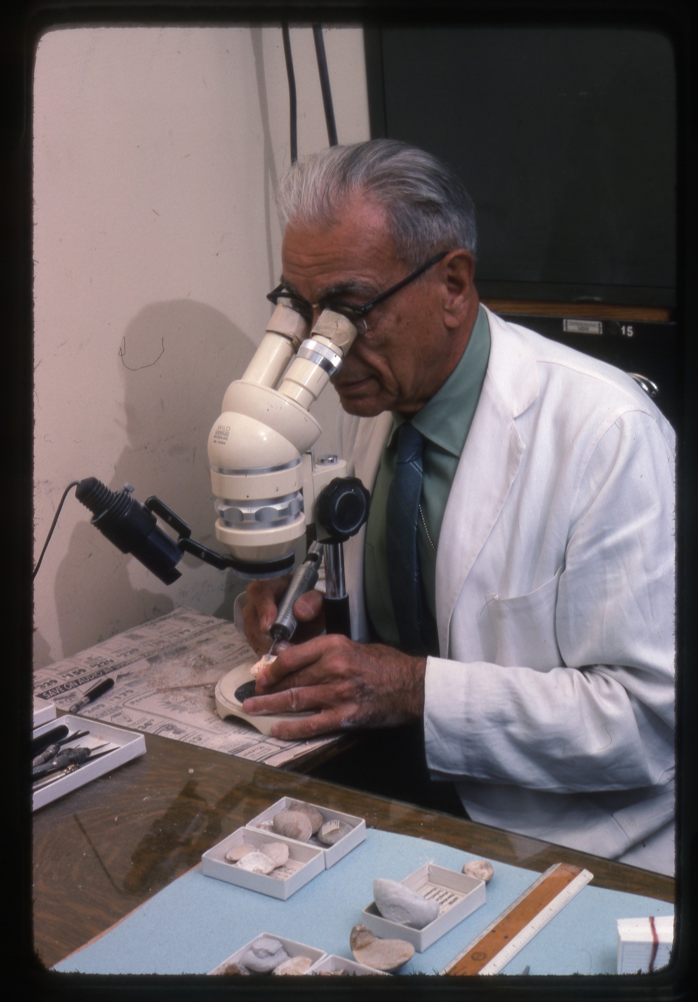 G. Arthur Cooper sits at a work station examining a specimen using a microscope.