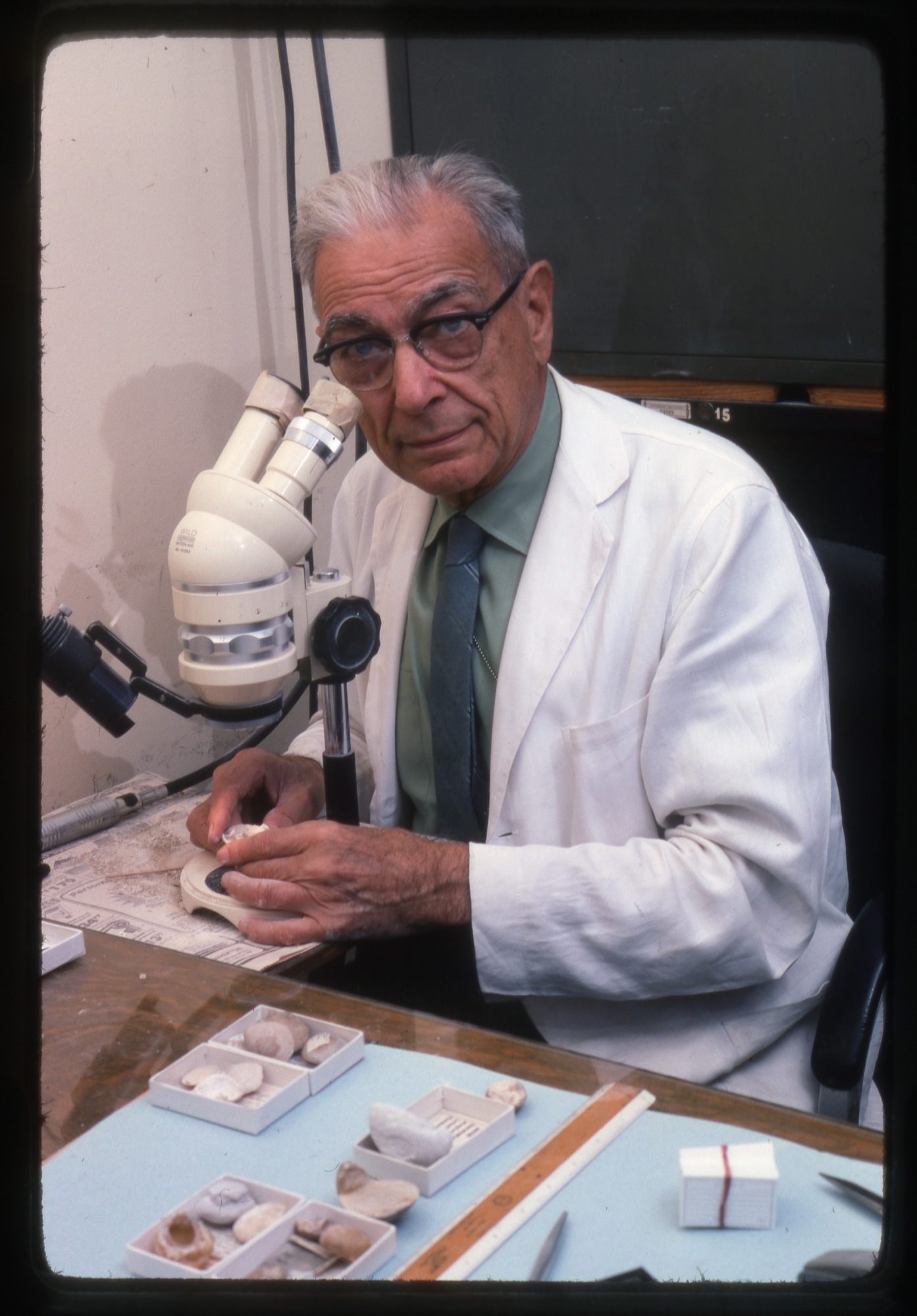 G. Arthur Cooper sits at a work station holding a fossil specimen in his hands to examine using a microscope.