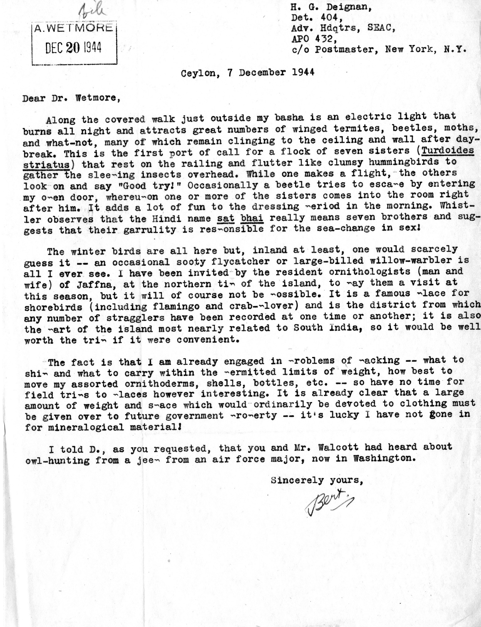 Letter from Herbert G. Deignan to Alexander Wetmore, December 7,1944