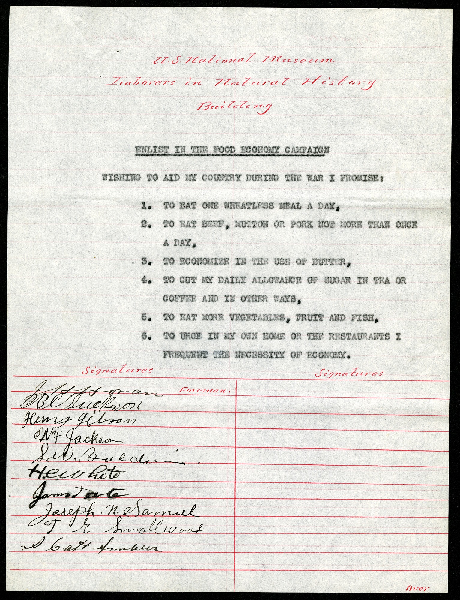 This pledge sheet lists the recommendations of the U.S. Food Administration and the signatures of the laborers of the Smithsonian's Natural History Building who pledged to follow these recommendations and conserve food during World War I.
