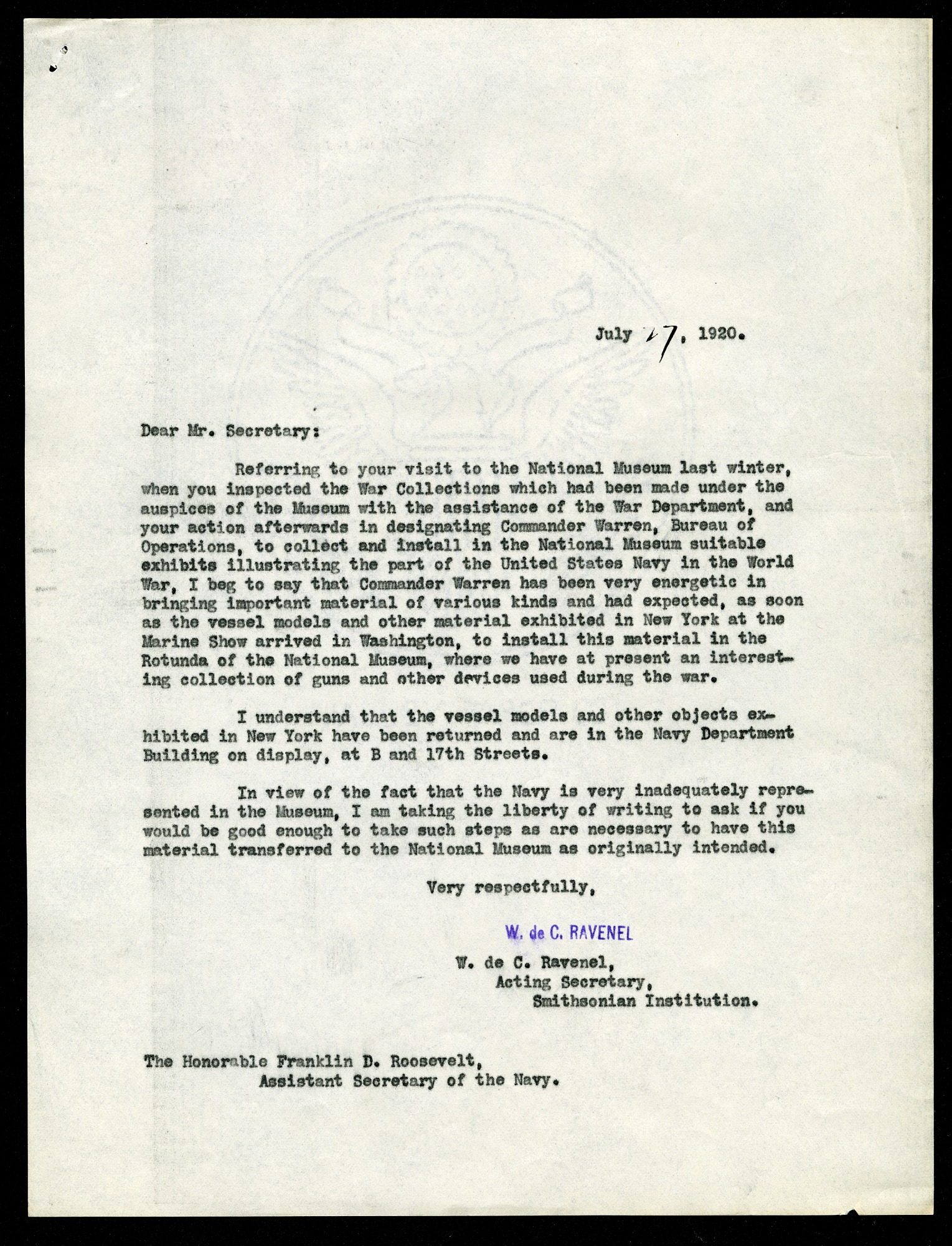 Letter from William deC. Ravenel, Acting Secretary, to Assistant Secretary of the Navy (and future President of the United States) Franklin D. Roosevelt discussing a previous visit to the Smithsonian's United States National Museum. He also discusses Commander Warren's work to collect and to install suitable exhibits on the Navy's role in World War I in the United States National Museum following the collection's exhibition in New York at the Marine Show. Ravenel writes that it is his understanding that the material has arrived in Washington and is on display at the Navy Department Building at B and 17th Street. Furthermore, as the Navy is very inadequately represented in the Museum, he is requesting that such steps as are necessary be taken to transfer this material to the National Museum as originally intended.