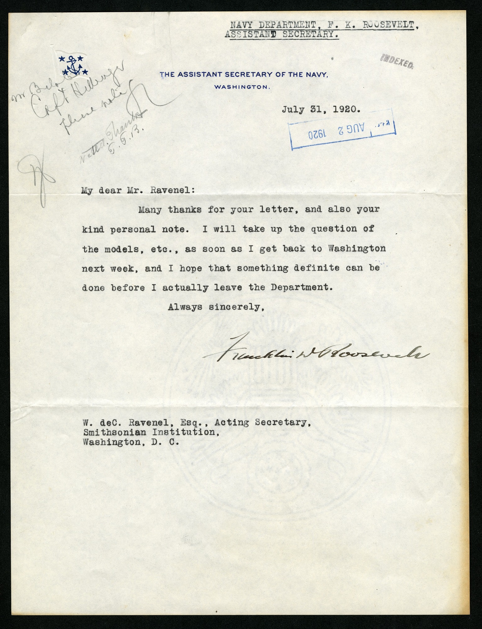Letter on Navy letterhead from (and signed by) Franklin D. Roosevelt, Assistant Secretary of the Navy, to William deC. Ravenel , Acting Secretary of the Smithsonian Institution, saying he will take up the question of models, etc. when he returns to Washington. The letter includes a note in pencil indicating this was read by T.T. Belote [Theodore T. Belote], Curator of the Division of History at the United States National Museum.