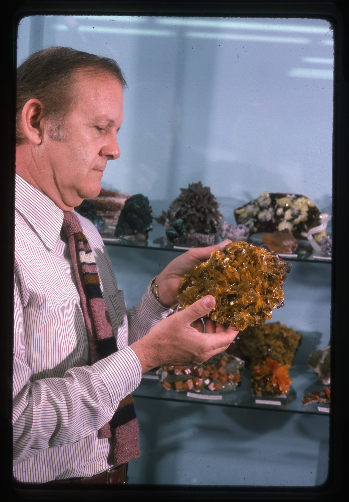 Paul E. Desautels (1920-1991), a mineralogist, curator of the Department of Gems and Minerals, at the National Museum of Natural History, holds a mineral specimen in his hands. Other mineral specimens can be seen on glass shelves in a display cabinet. He was Associate Curator and Curator of the Division of Mineral Sciences from 1963-1983.