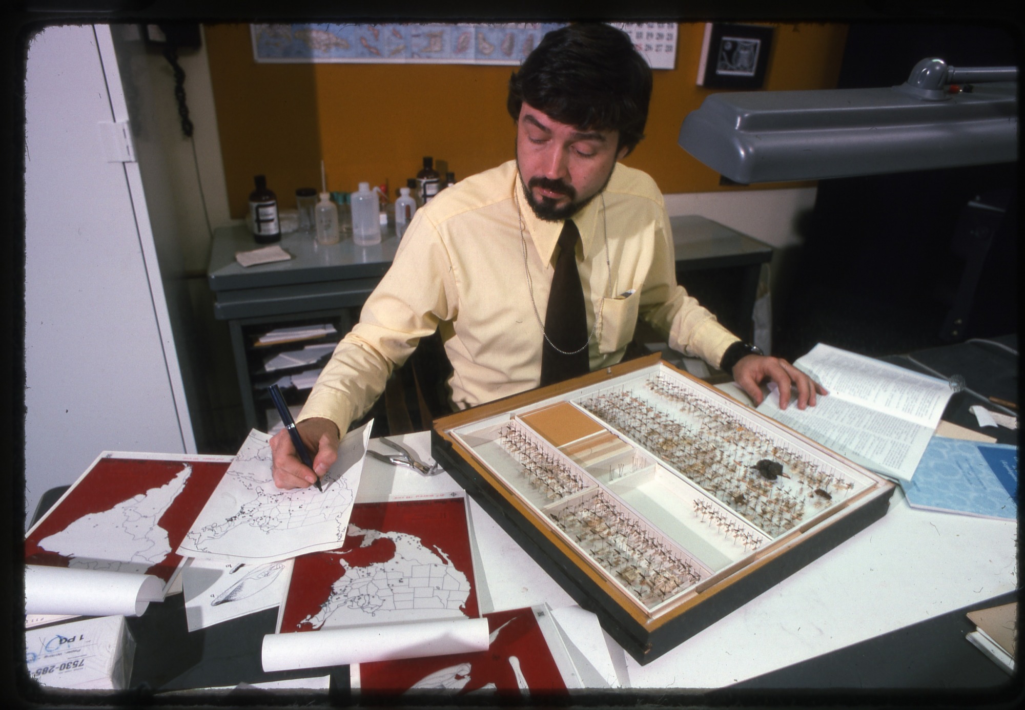 W. Donald Duckworth was an entomologist and associate curator with the Department of Entomology, National Museum of Natural History. He is holding a pen in his right hand as he marks a map. A quarter unit tray containing moth specimens sits on the table. There is a map on the wall behind him and maps on the table beside him.
