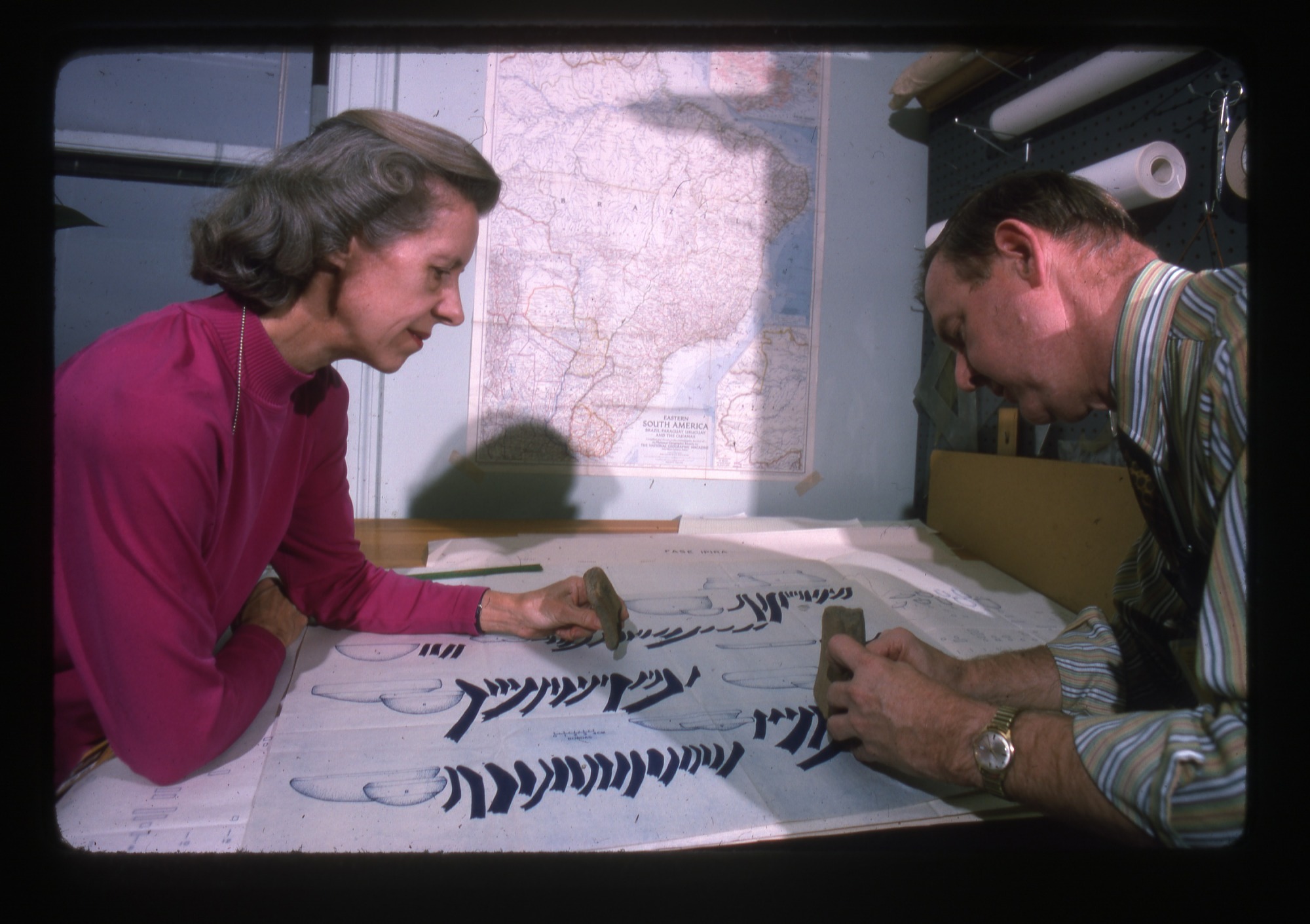 With the Department of Anthropology at the National Museum of Natural History, Betty J. Meggers and Clifford Evans, anthropologists, were a husband and wife team, who specialized in Amazonian anthropology. A large diagram is on the table and a map of South America hangs on the wall.