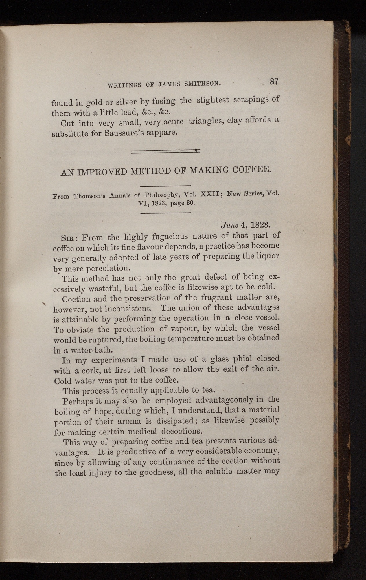"An Improved Method of Making Coffee," published by James Smithson in Thomson's Annals of Philosophy, Vol. XXII; New Series Vol. VI, 1823, page 30. In this article, Smithson recommends heating coffee in an enclosed glass vessel sealed with a cork to retain the flavor and aroma of the coffee beans. The founding donor of the Smithsonian did serious research on the composition of minerals, as well as experiments with practical applications.