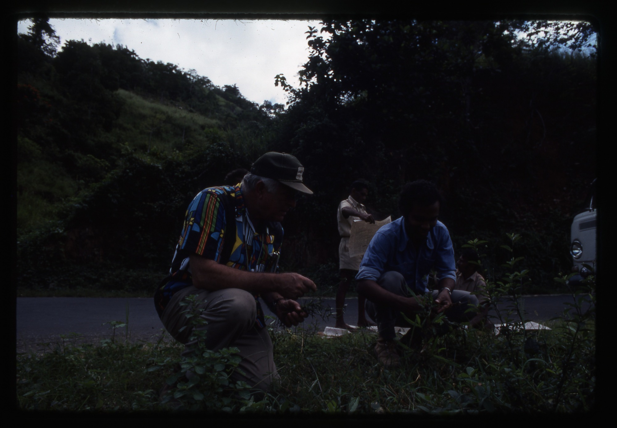 With three local assistants in Sri Lanka, F. Raymond Fosberg (1908-1993) is shown examining plant life beside a river. One of the locals is holding a large piece of paper (probably a map).