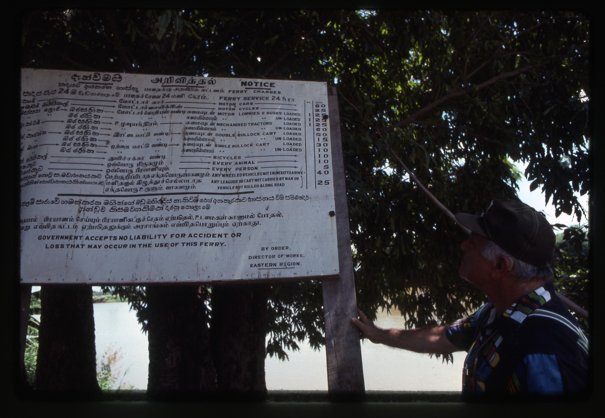 While on a field trip to Sri Lanka, Dr. F. Raymond Fosberg (1908-1993) stops to look at a sign written in a native language with an English translation below that says "Government accepts no liability for accident or loss that may occur in the use of this ferry. By order Director of Works, Eastern Region."