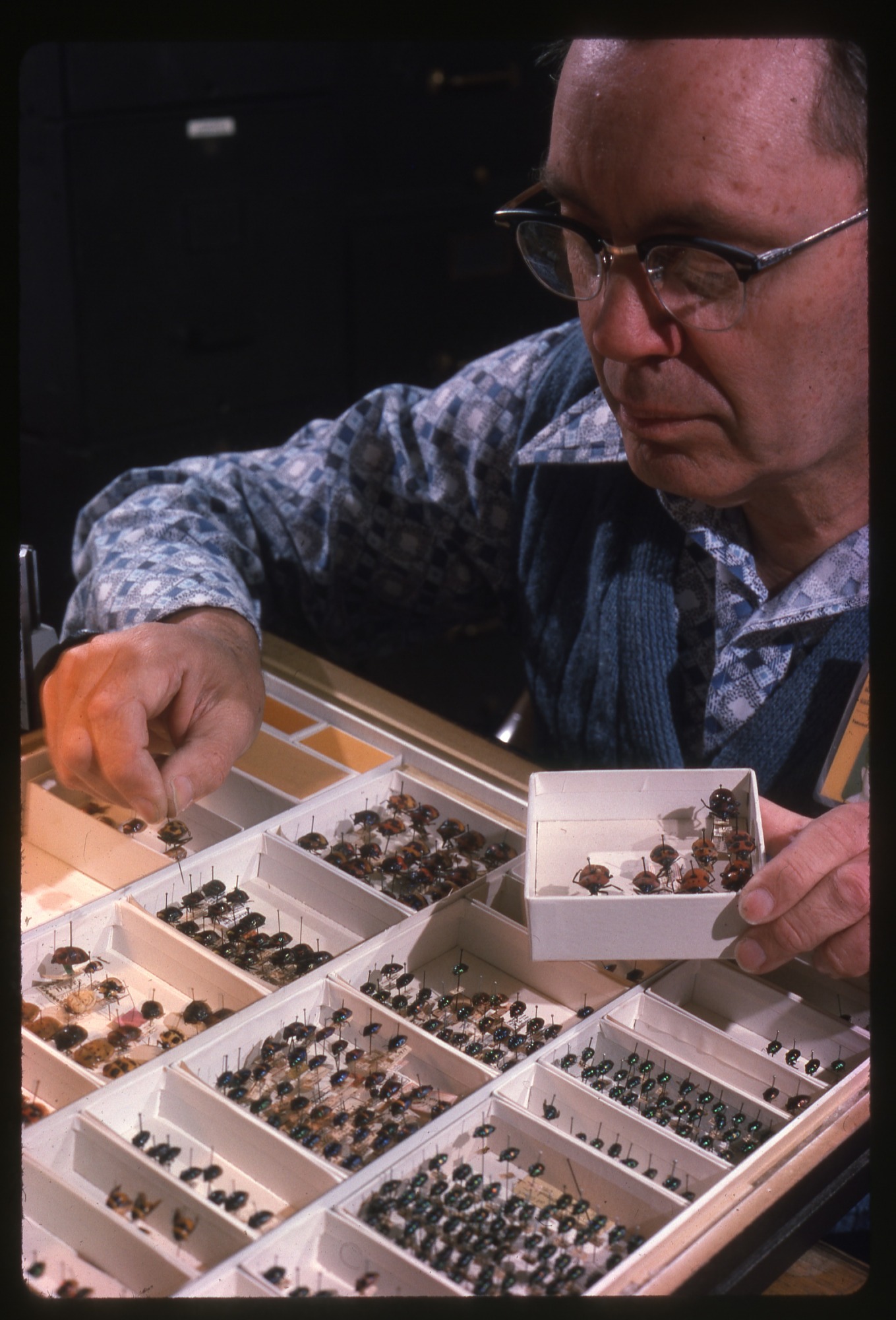 Richard C. Froeschner (1916-2002) , Curator, Department of Entomology, National Museum of Natural History, Smithsonian Institution, sits at a table holding a section from a tray holding insects and has in his right hand one insect. His works on insects included: Heteroptera or True Bugs of Ecuador: A Partial Catalog; True Bugs of Panama; and Lace Bug Genera of the World.