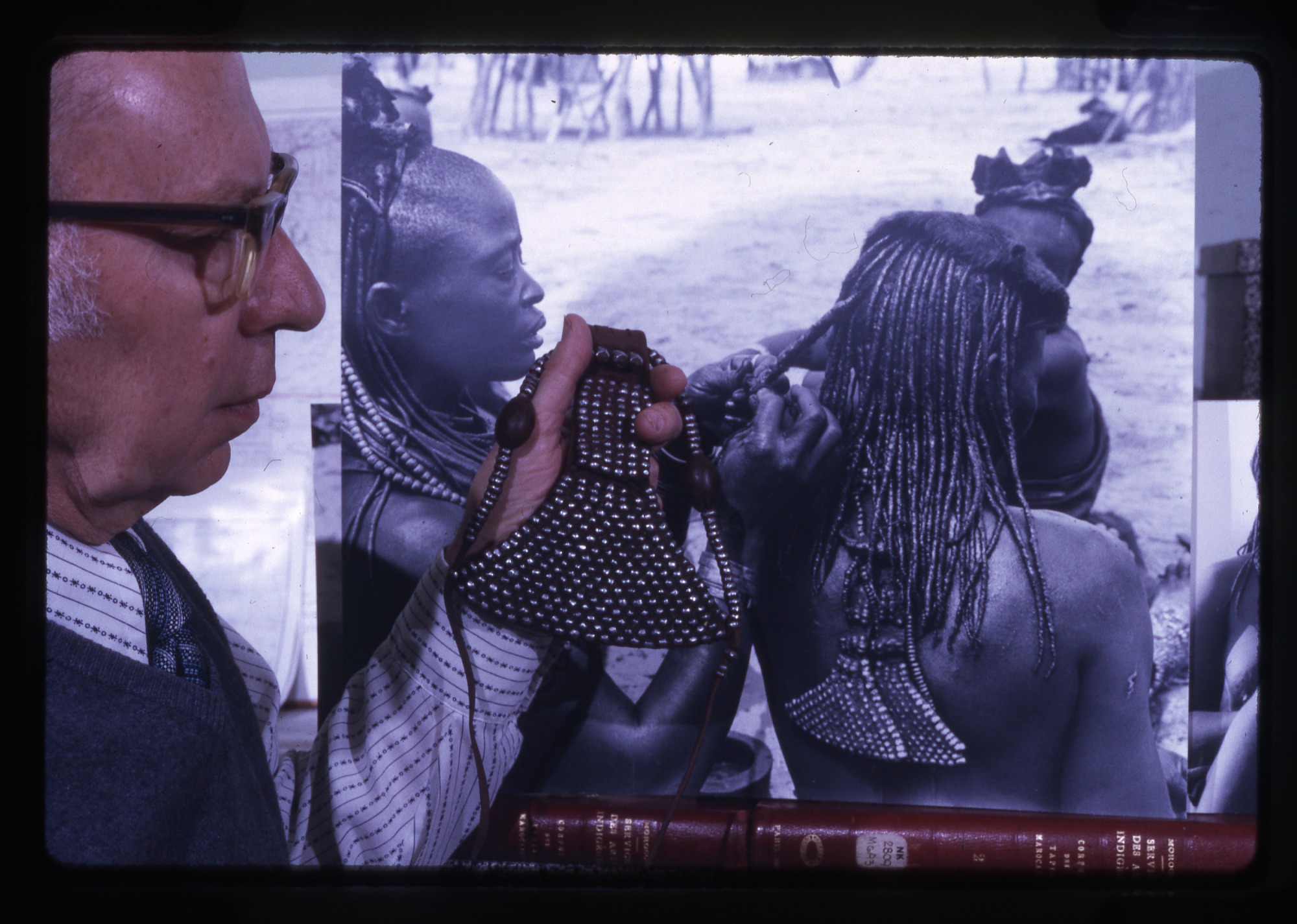 - As he prepares several of his photographs for exhibition, Ethnologist Gordon Gibson of the Department of Anthropology in the National Museum of Natural History, standing to the left, compares a beaded headdress with one in his photo of Himba women of Namibia, which is located on the south Atlantic coast of Africa and previously known as South West Africa.