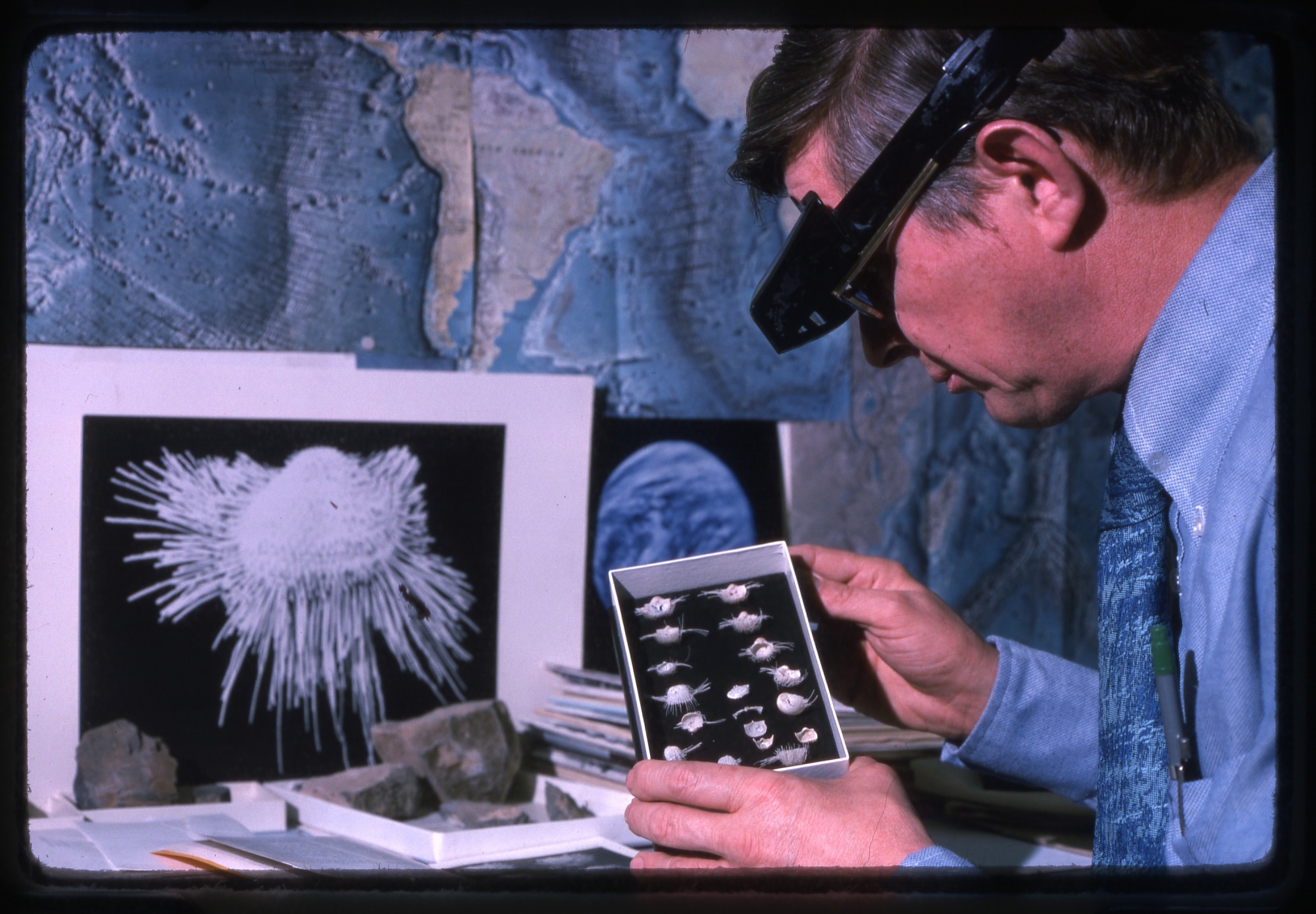 - Dr. Grant holds up a tray containing a group of delicate brachiopods as he compares them with an enlarged photograph of one sitting in rock matrix. A photograph of South America can be seen on the wall. Other rocks are in a tray on a flat surface. Dr. Grant is wearing optical magnifier glasses.