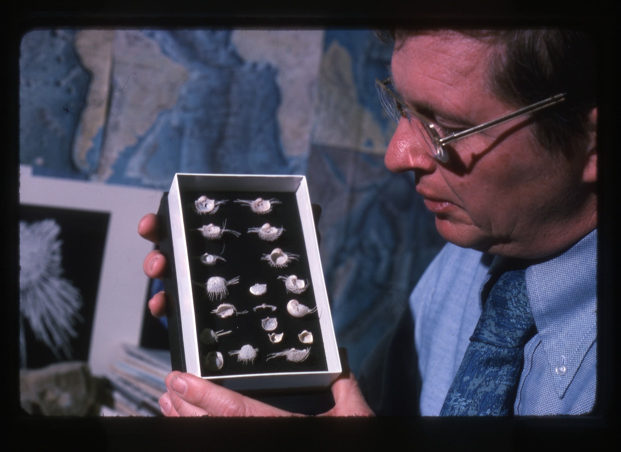 - Dr. Grant holds up a tray displaying delicate Brachiopods. To the left is a partial view an enlarged photograph of a brachiopod and behind muted photographs of South America and Africa on the wall.