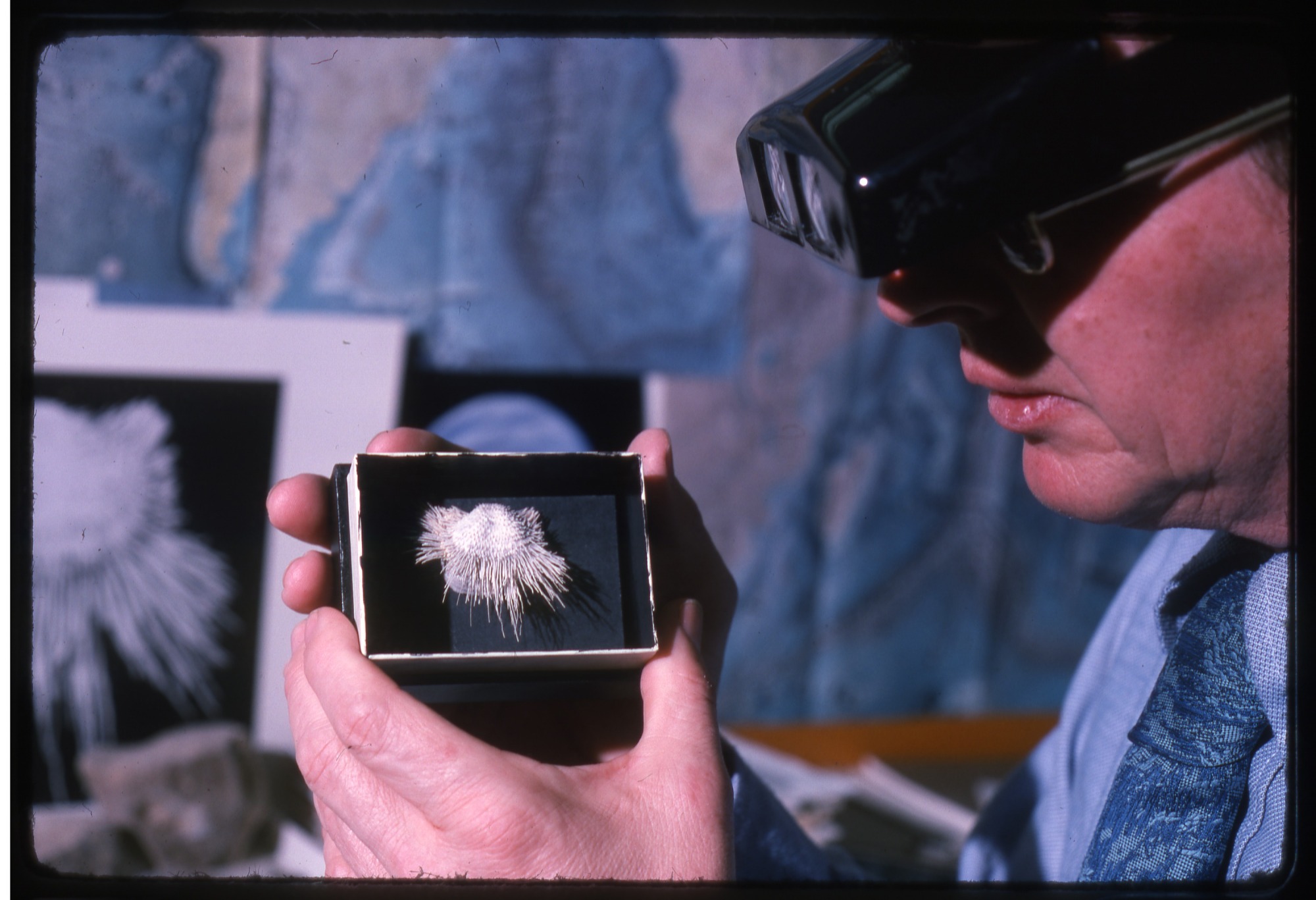 - Dr. Grant wearing optical magnifier holds in his hands a collection box containing a brachiopod. A blurred photograph of a brachiopod is pinned to the wall behind him.