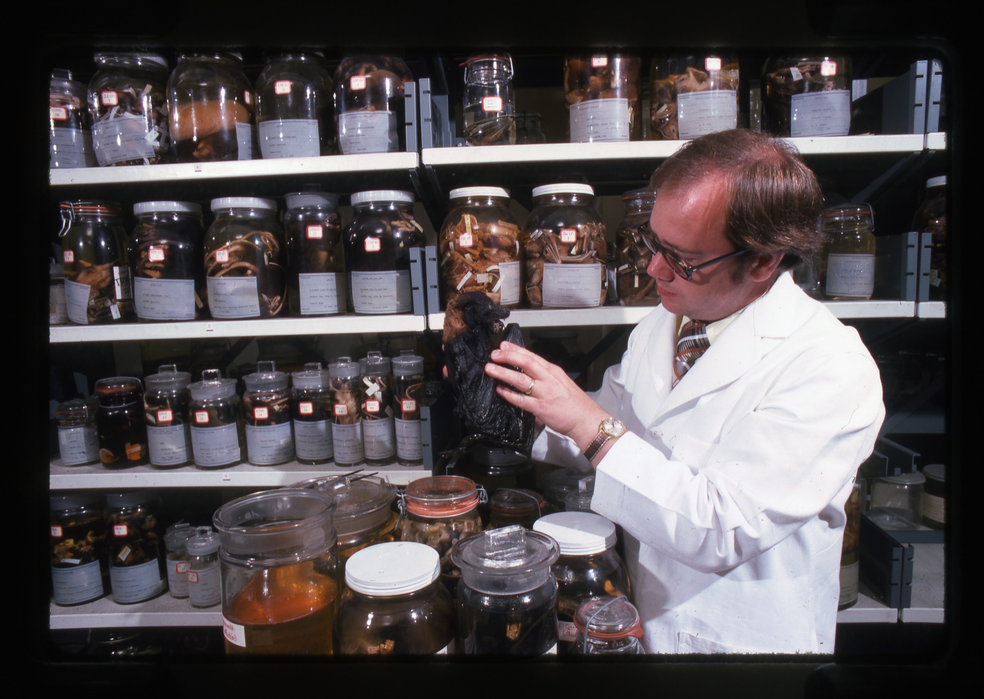 - Francis M., "Frank," Greenwell, taxidermist, museum specialist in collections management, wearing a white lab coat is in a collections storage and work area at the National Museum of Natural History, Department of Zoology, and holds in his hand a wet vertebrate specimen (probably a bat) he has taken from an open jar. Other jars containing specimens sit on the table and on shelves behind him.