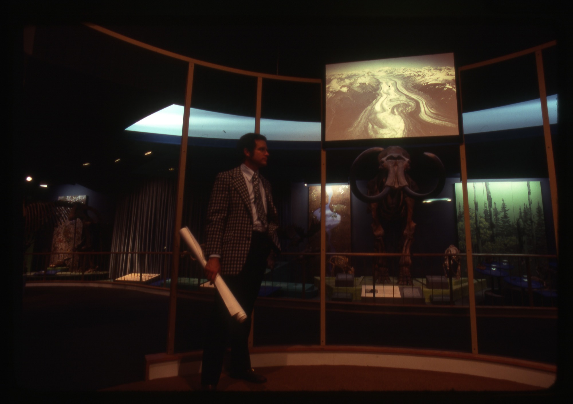 - Leo J. Hickey, paleobotanist with the Department of Paleobiology, National Museum of Natural History, holds a rolled up paper (probably plans for the Hall) as he stands to the left front of the Ice Age Mammals and the Emergence of Man (Exhibition) Hall. Above is a large image of a glacier. Behind him in the Hall can be seen the skeleton of a mastodon with its curled tusks. Smaller ice age mammals are also displayed.
