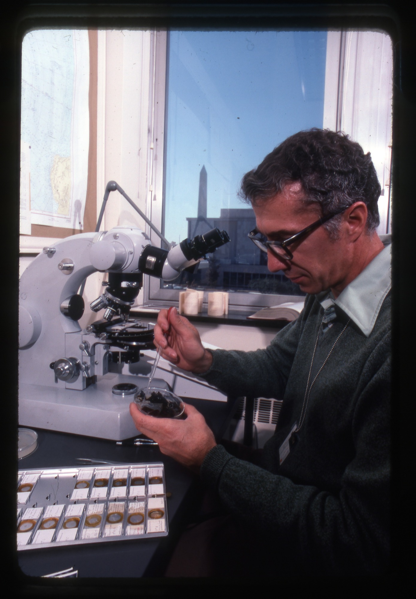 In his office in the northwest corner of the Natural History Building, W. Duane Hope of the Department of Invertebrate Zoology, National Museum of Natural History, holds a petri dish containing worm parts On the table are a microscope and slides in a slide holder tray. His research focused on the systematics, comparative and functional ultrastructure, and phylogenetics of marine nematode worms. Through the window can be seen the Washington Monument and a portion of the National Museum of History and Technology (now the National Museum of American History).