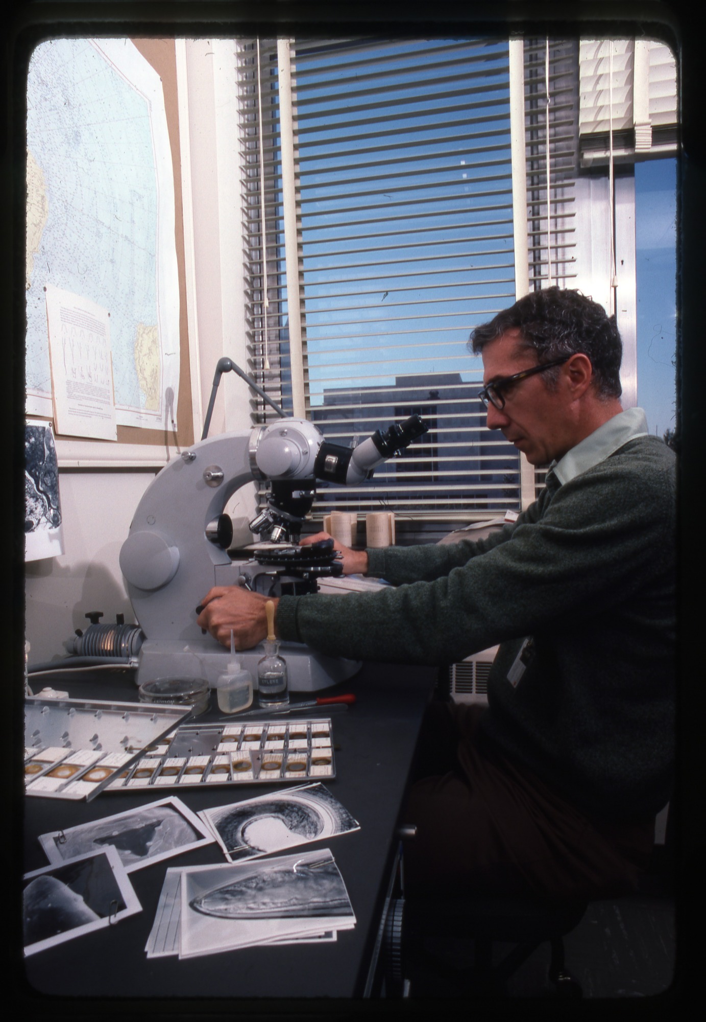 In his office in the northwest corner of the Natural History Building, W. Duane Hope of the Department of Invertebrate Zoology, National Museum of Natural History, sits at his table looking into a microscope as he adjusts the focus with his left hand. On the table are slide holder trays, and photos of worm body parts. On the wall there is a partial view of a large map. His research focused on the systematics, comparative and functional ultrastructure, and phylogenetics of marine nematode worms. A partial view of the National Museum of History and Technology (now the National Museum of American History), can be seen through the window.