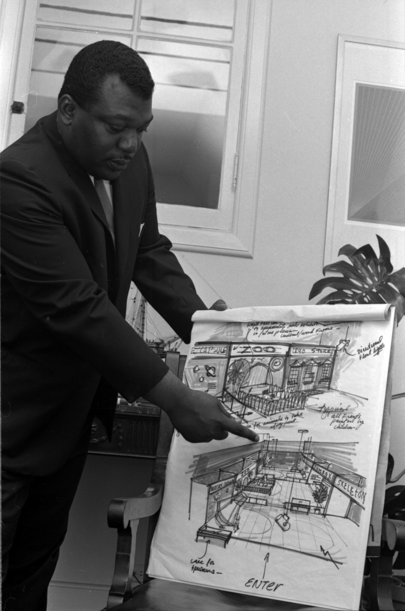 Photograph of John R. Kinard, founding director of the Anacostia Neighborhood Museum, now known as the Anacostia Community Museum, featuring an artist's rendition of how the Old Carver Theater will look after the renovation transforming it into a museum.