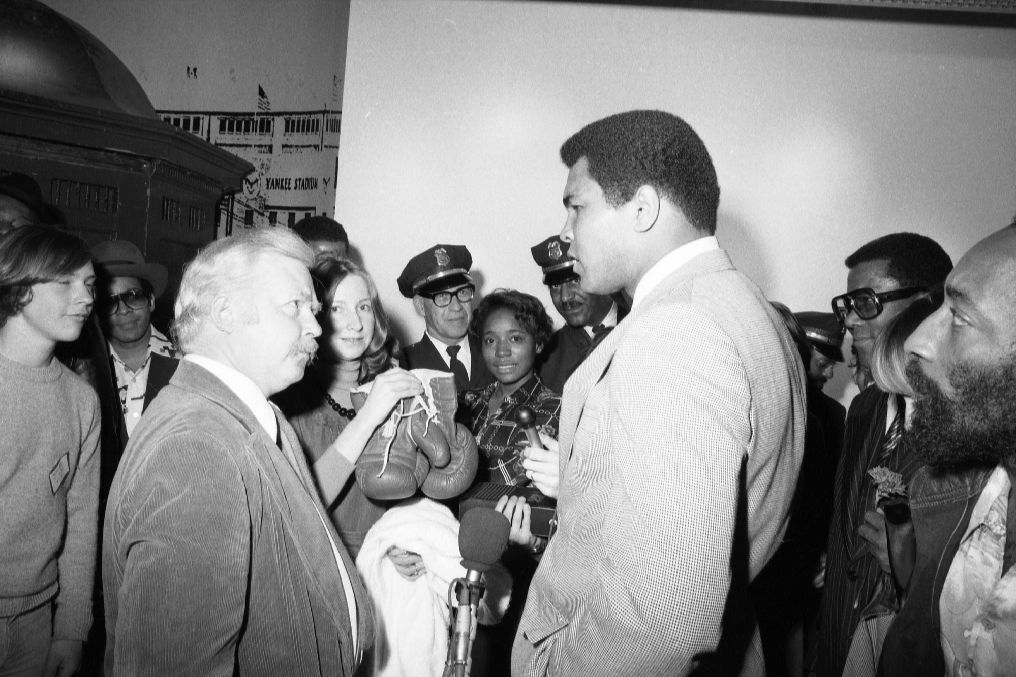 Muhammad Ali and Curators Ellen Roney Hughes and Carl Scheele during Ali's visit to the National Museum of History and Technology, now the National Museum of American History, on March 17, 1976, when he donated a pair of boxing gloves and a robe to the museum for the Nations of Nations exhibition.