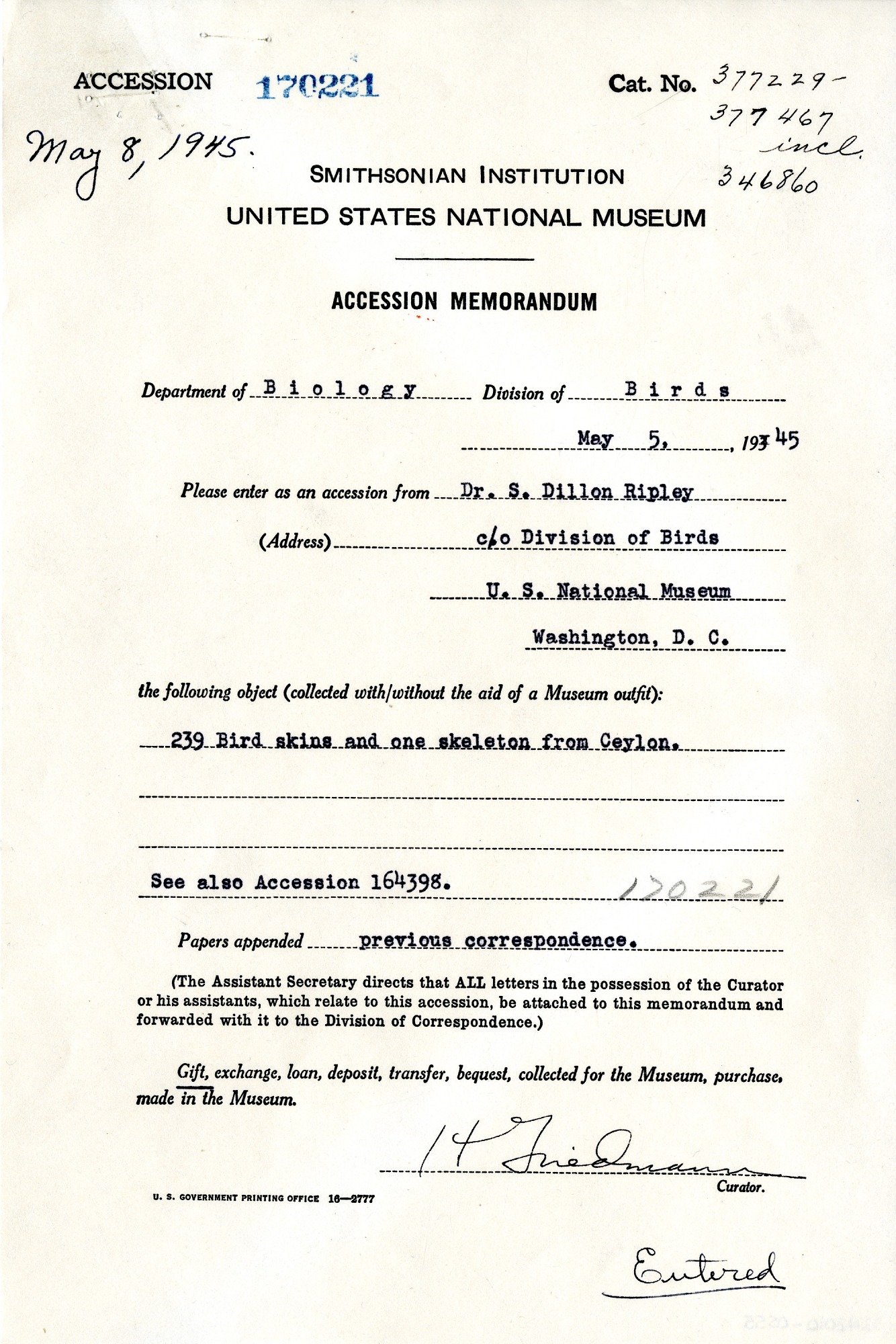 Accession Memorandum form of the United States National Museum records the donation by S. Dillon Ripley, of 239 bird skins and one skeleton, which he had collected in Ceylon (now Sri Lanka, and sent by him to the Department of Biology, Division of Birds.