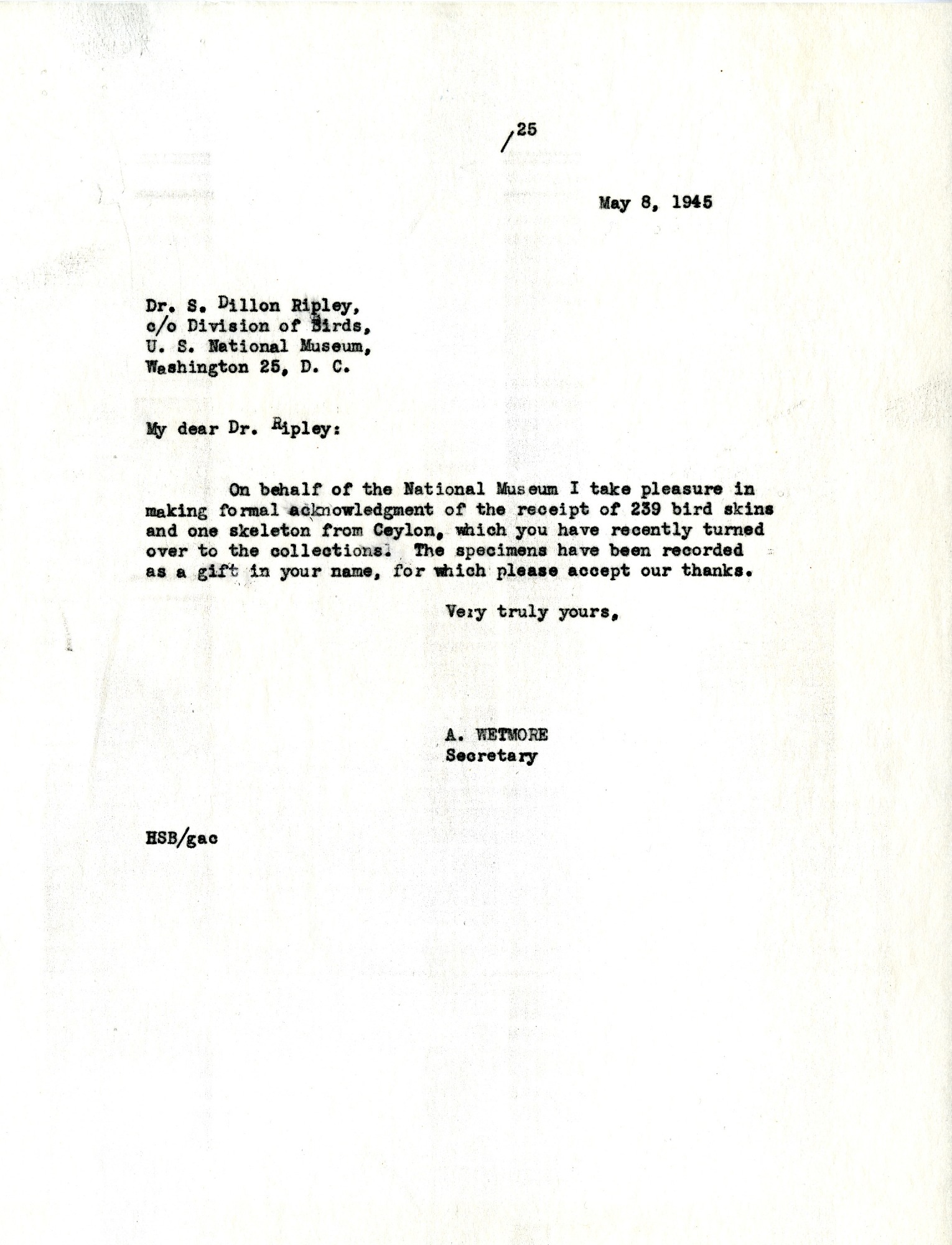 Letter from Smithsonian Assistant Secretary Alexander Wetmore to S. Dillon Ripley acknowledges the donation and receipt of 239 bird skins and one skeleton Ripley collected in Ceylon, now Sri Lanka, and sent to the U.S. National Museum for their collection.