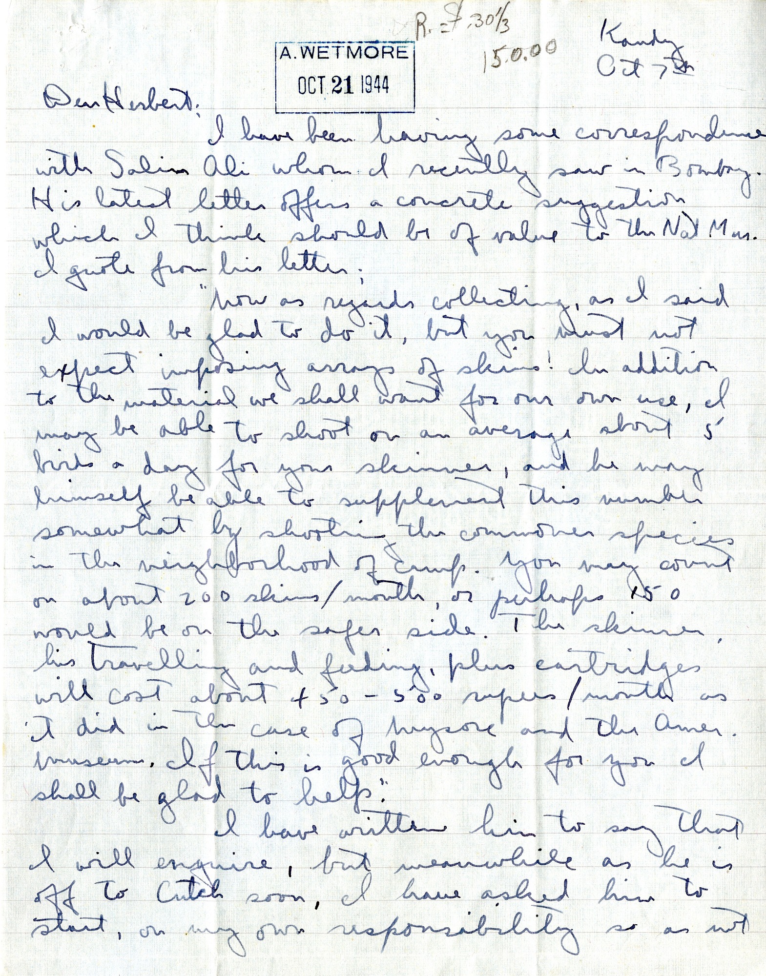 Page 1 of a letter from S. Dillon Ripley to Herbert Friedmann, curator of birds at the U.S. National Museum, quotes from a letter from Salim Ali of the Bombay Natural History Society about Ali's proposed collecting of bird skins in India for the U.S. National Museum.