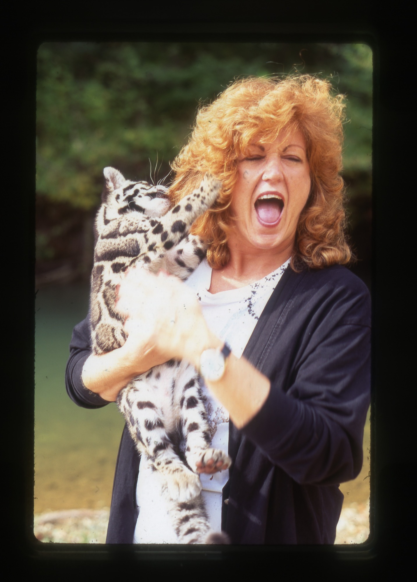 A clouded leopard cub born via artificial insemination plays with veterinarian JoGayle Howard's hair as she attempts to pose for the camera at the National Zoological Park. Howard was a specialist in reproductive biology for endangered species.