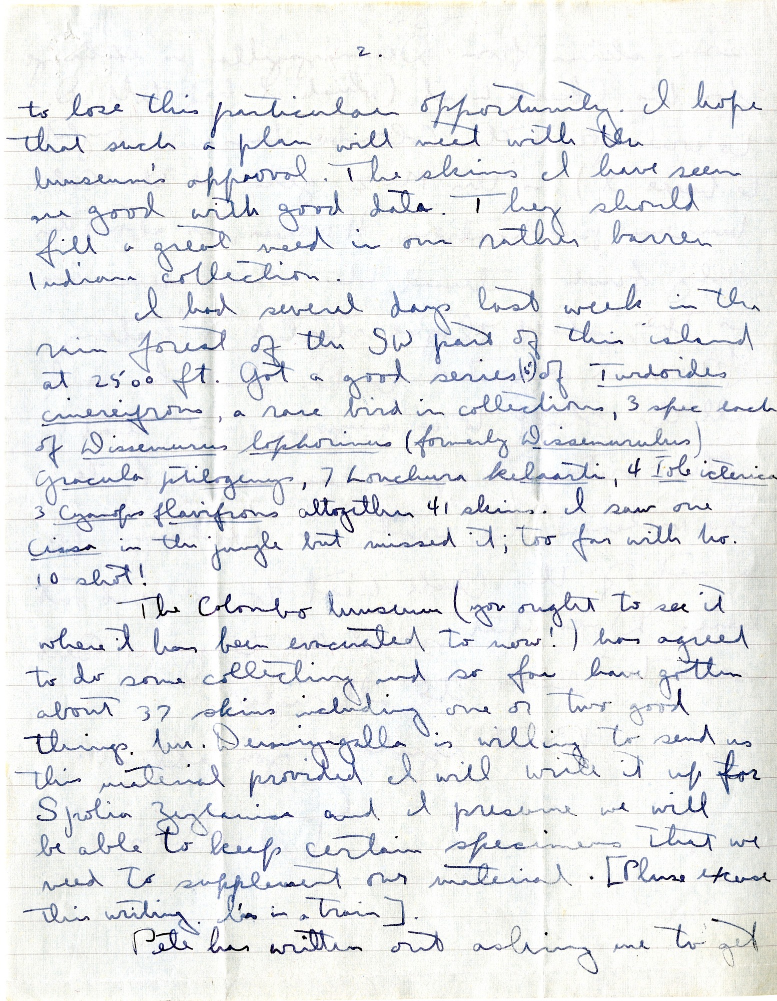 Page 2 of a letter from S. Dillon Ripley to Herbert Friedmann, curator of birds at the U.S. National Museum, continues on about Salim Ali's collection; mentions that he had spent several days in the rain forest of the southwest part of this island (Sri Lanka); names several birds he saw and that he collected altogether 41 skins; and that the Colombo Museum has agreed to do some collecting. He mentions that Mr. P.E.P. Deraniyagala is willing to send this material.
