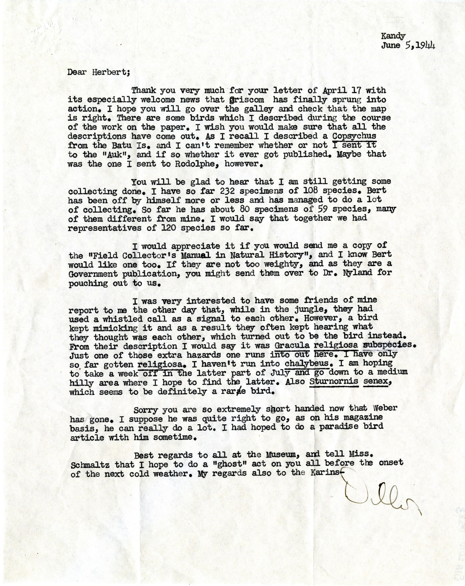 S. Dillon Ripley writes that he hopes Herbert Friedmann, curator of birds, U.S. National Museum, will go over the galleys and check on the map and other items. He also writes that he is still collecting and has so far 232 specimens of 108 species. Ripley asks that he be sent a copy of the "Field Collectors Manual in Natural History" and one for Bert [Herbert G. Deignan] too. He relays that friends have been in the jungle and were using a whistled call as a signal. He describes what happened as a result.