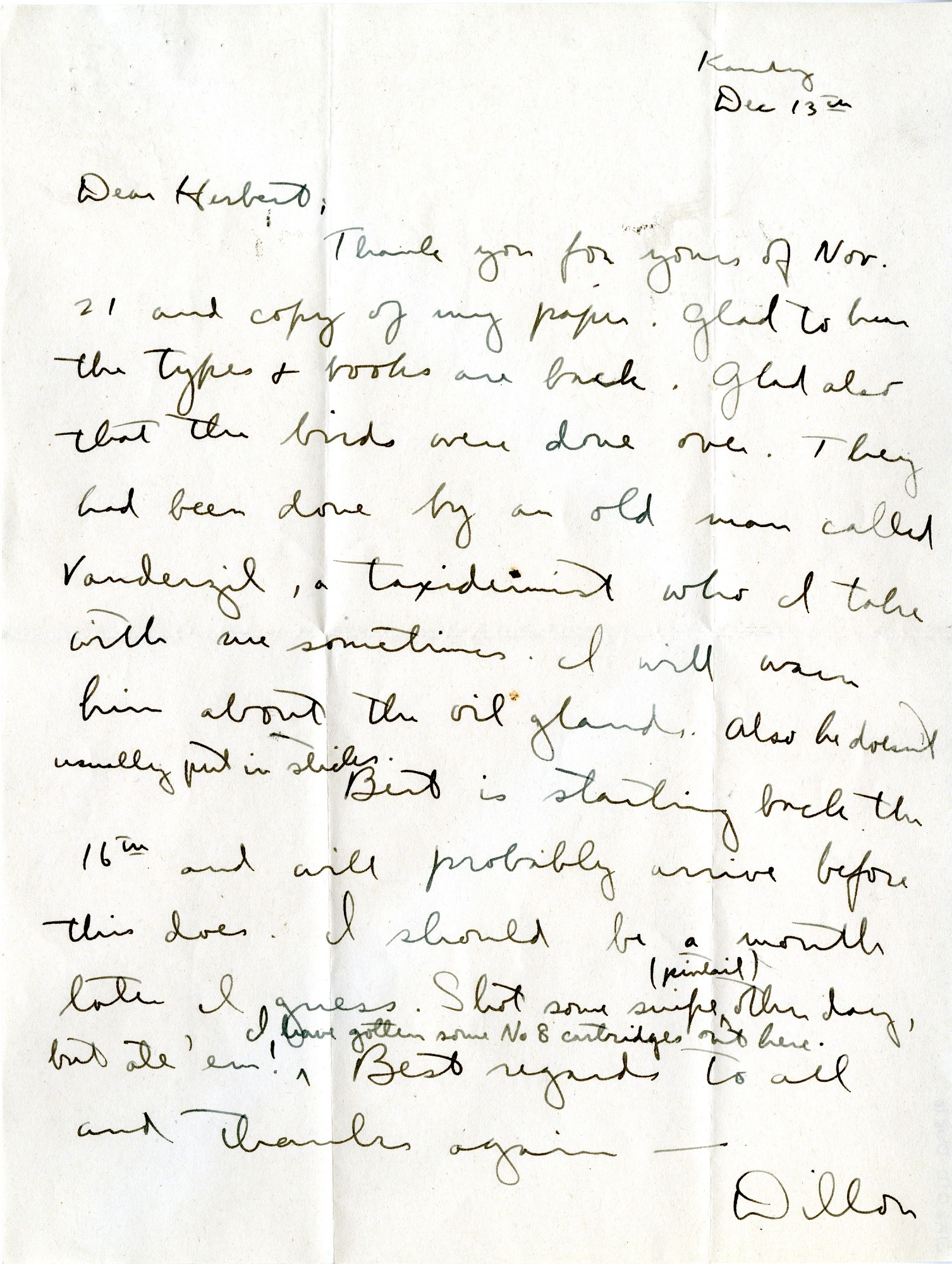 Letter from S. Dillon Ripley to US National Museum curator of birds Herbert S. Friedmann says that he is glad to receive a copy of his paper, that he is glad that the types and books are back; and that he is glad that the birds were done over. He writes that the birds were done by an old man called Vandergil, a taxidermist, that Ripley takes with him sometimes, and that he (Ripley) will warn him about the oil glands. He also notes that [Herbert G. Deignan] Bert is starting back and Ripley should follow in a month. He also writes that he shot some swipe (pintail) and ate 'em.