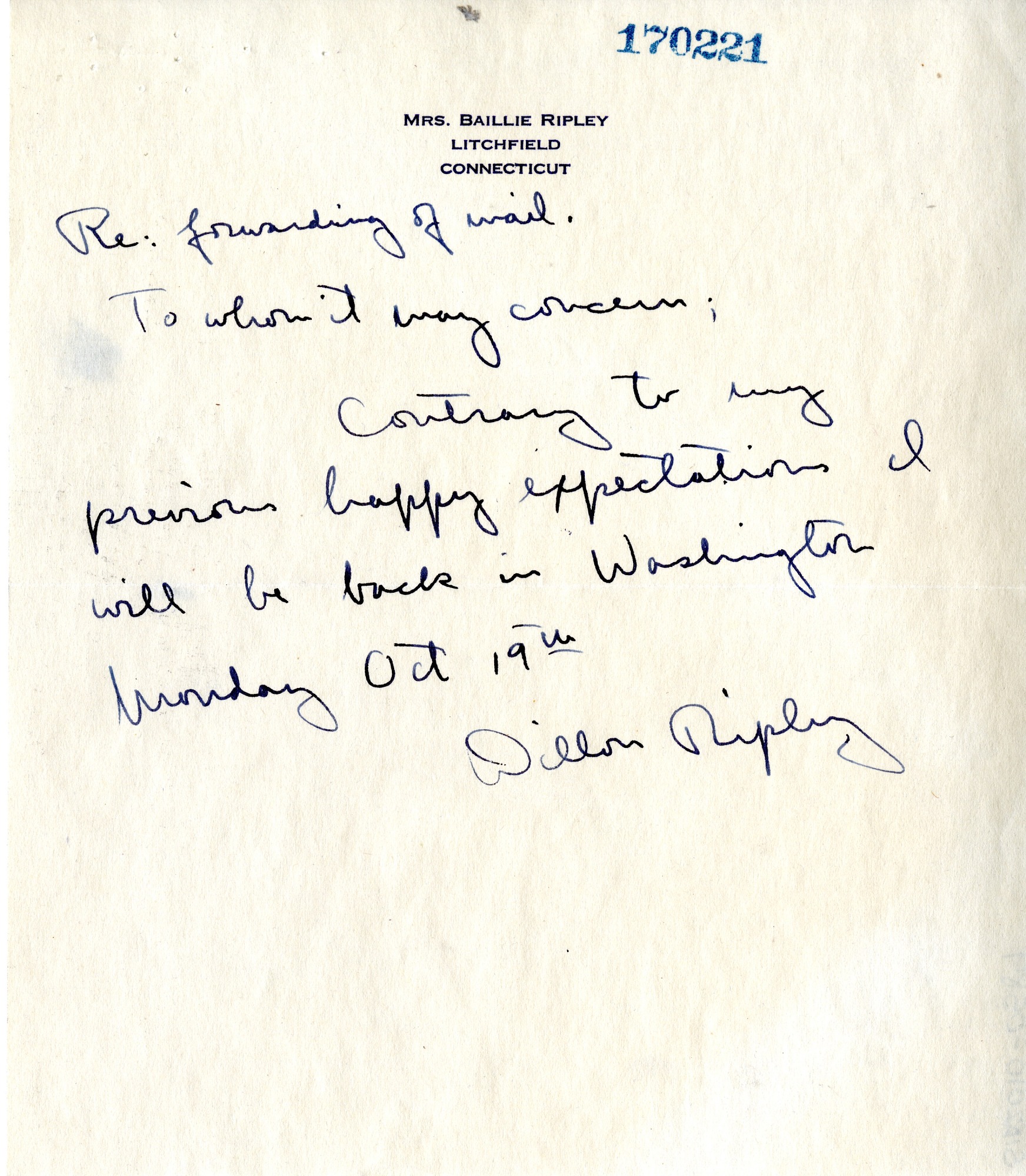 Office of Strategic Services officer S. Dillon Ripley writes "To whom it may concern" note regarding forwarding of his mail since he will be back in Washington on Monday, October 19, 1942.