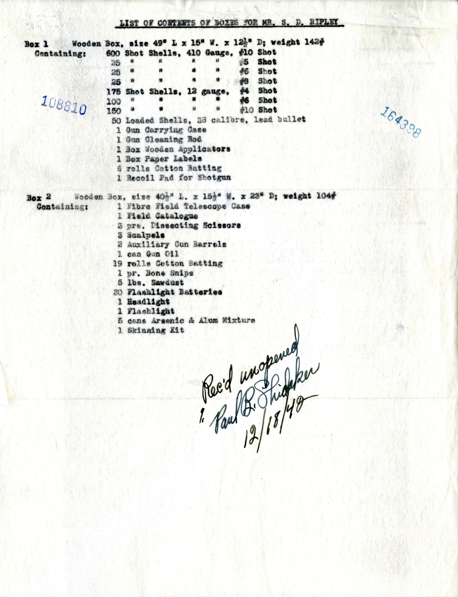 List of contents of two boxes of field collecting equipment sent from Smithsonian Institution to S. Dillon Ripley, ornithologist serving with the Office of Strategic Services in Ceylon (now Sri Lanka), so he can collect specimens for the U.S. National Museum.