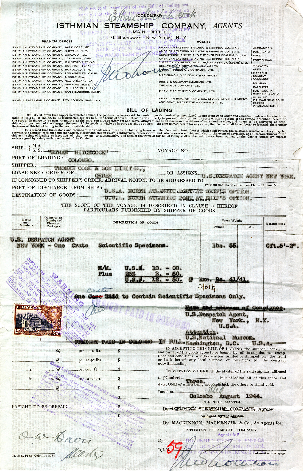 Page 1 of Bill of Lading, Isthmian Steamship Company, Agents, for the shipping on the "Ethan Hitchcock" from Colombo to U.S. Dispatch Agent, New York, of one crate of scientific specimens. While in the Office of Strategic Services in Ceylon (now Sri Lanka), S. Dillon Ripley collected bird specimens which he shipped to the United States National Museum.