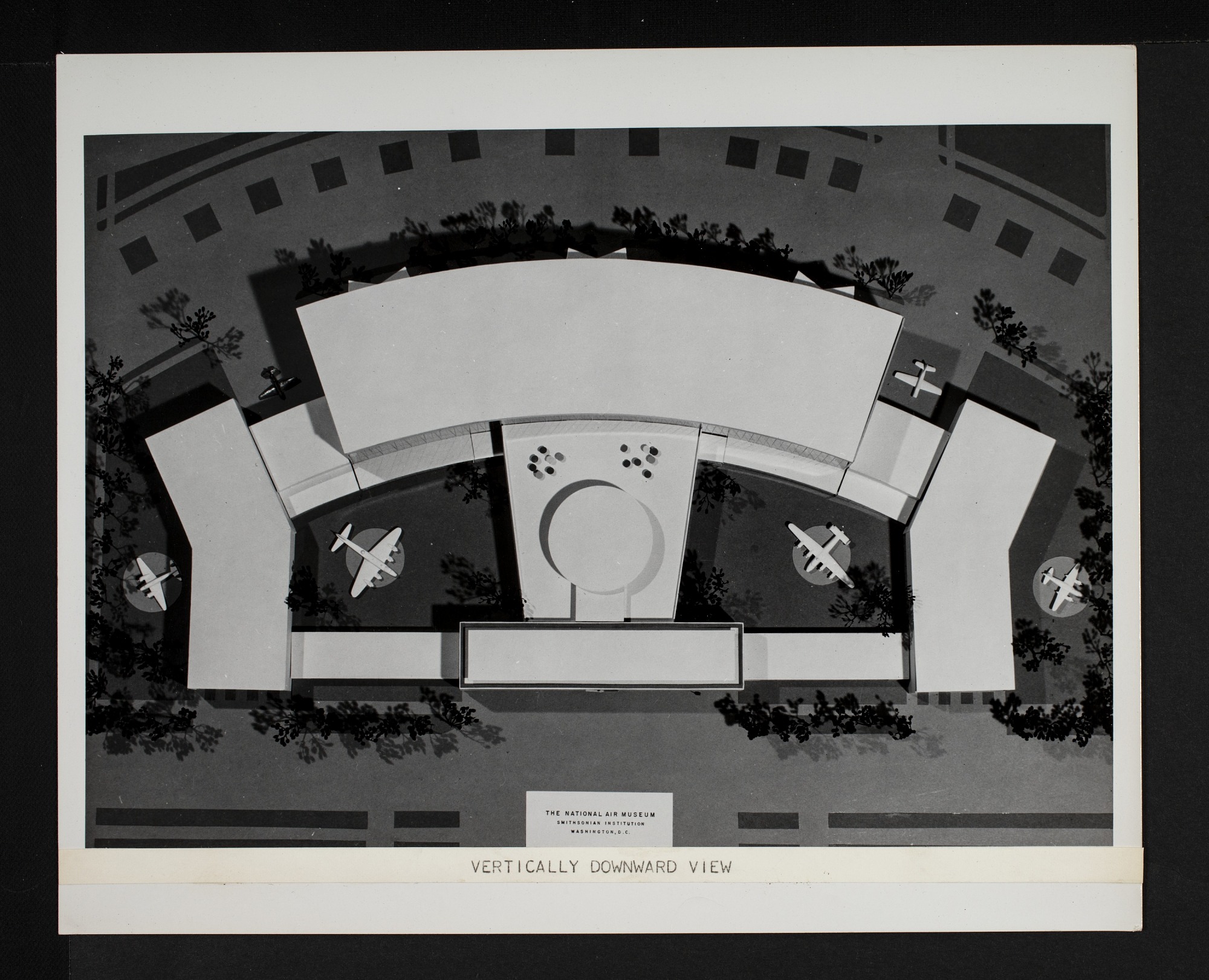 Looking downward, a concept model called the "Wineglass Design", submitted by McKim, Mead & White, Architects, for new National Air Museum (now known as the National Air and Space Museum) shows the roof for the proposed building and with airplanes in various locations. This design was not chosen.