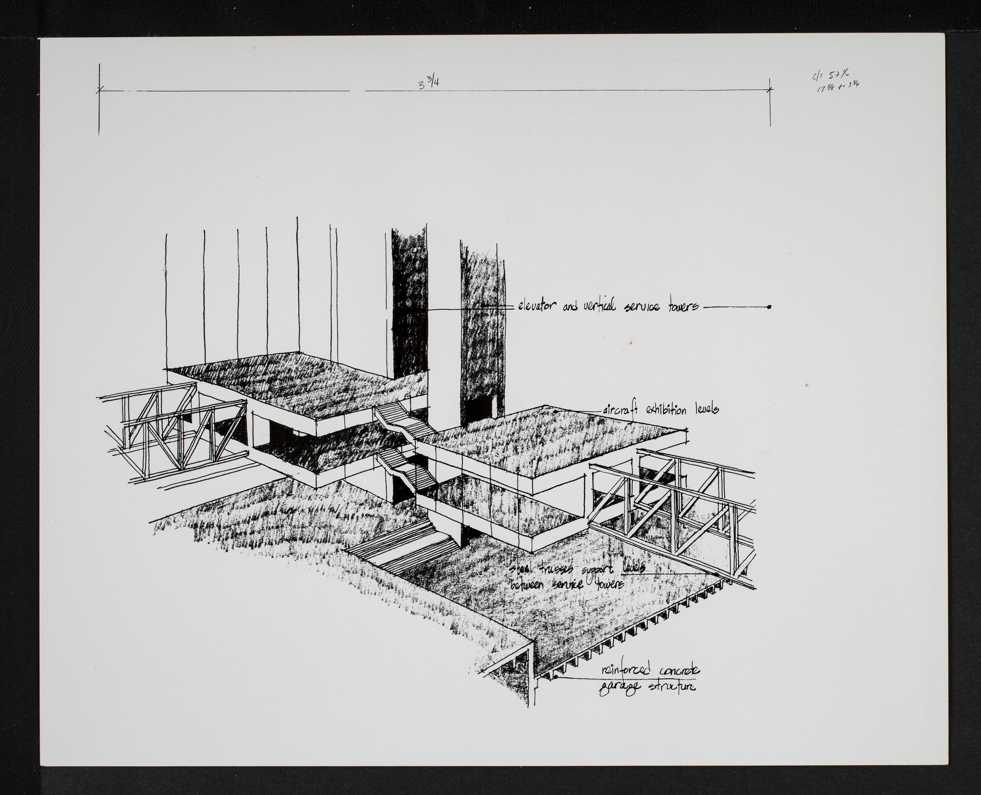 The original design was revised and this final design is a multi-level drawing of a portion of the interior for the new National Air Museum (now known as the National Air and Space Museum), designed by Gyo Obata of Hellmuth, Obata & Kassabaum (HOK). The drawing has labels indicating elevator and vertical service towers, aircraft exhibition levels, and reinforced concrete/garage structure.