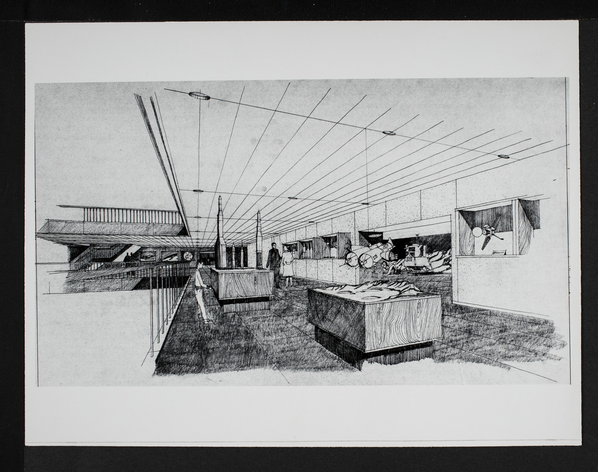 The original design was revised and this final design is a drawing of a portion of the interior for the new National Air and Space Museum, designed by Gyo Obata of Hellmuth, Obata & Kassabaum (HOK). The drawing is of an exhibit area with rockets and other space objects as well as three people.