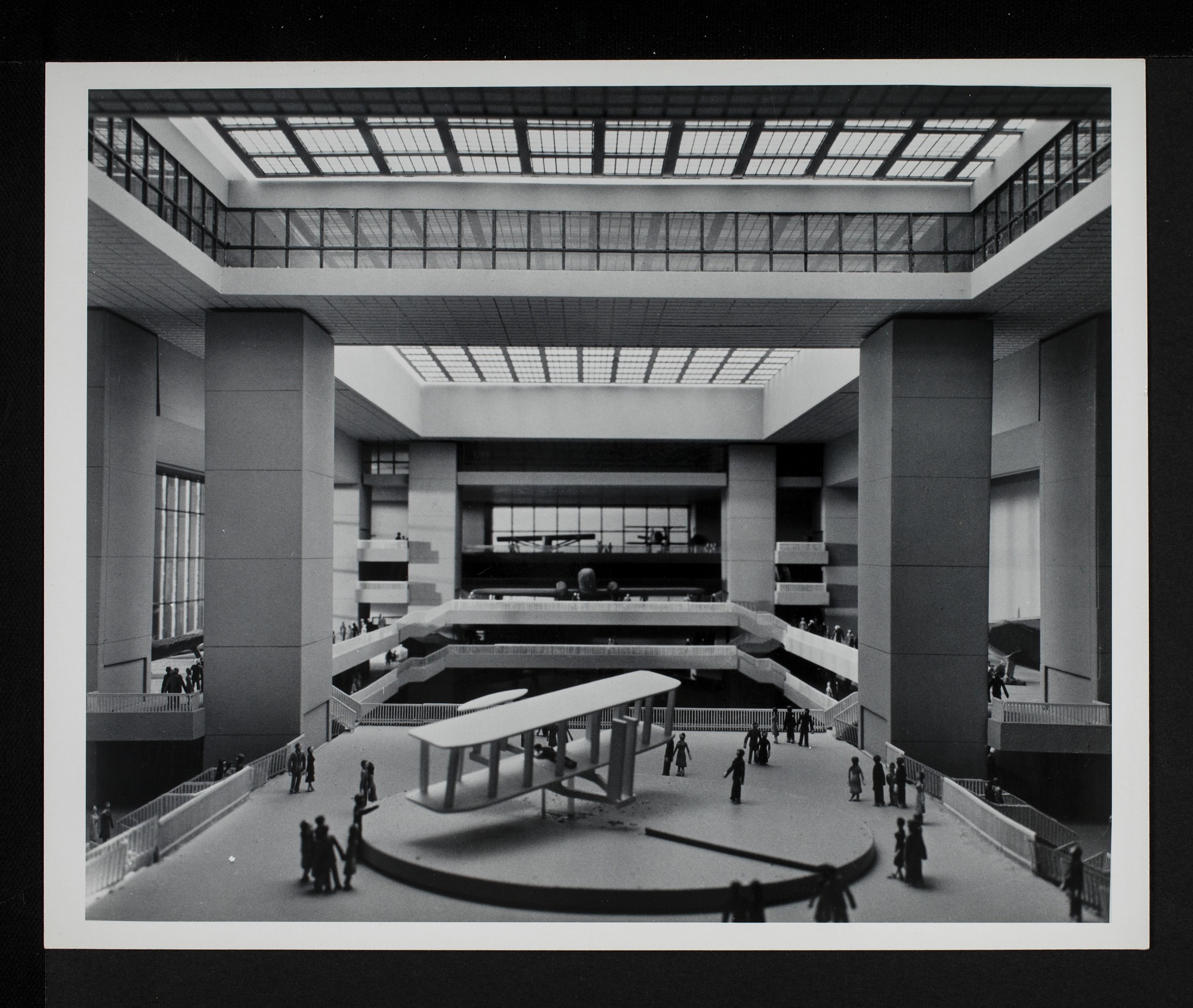 The original design by HOK was revised and this final design model for the National Air and Space Museum is of the interior showing rockets, planes, multi-levels, display areas and visitors.