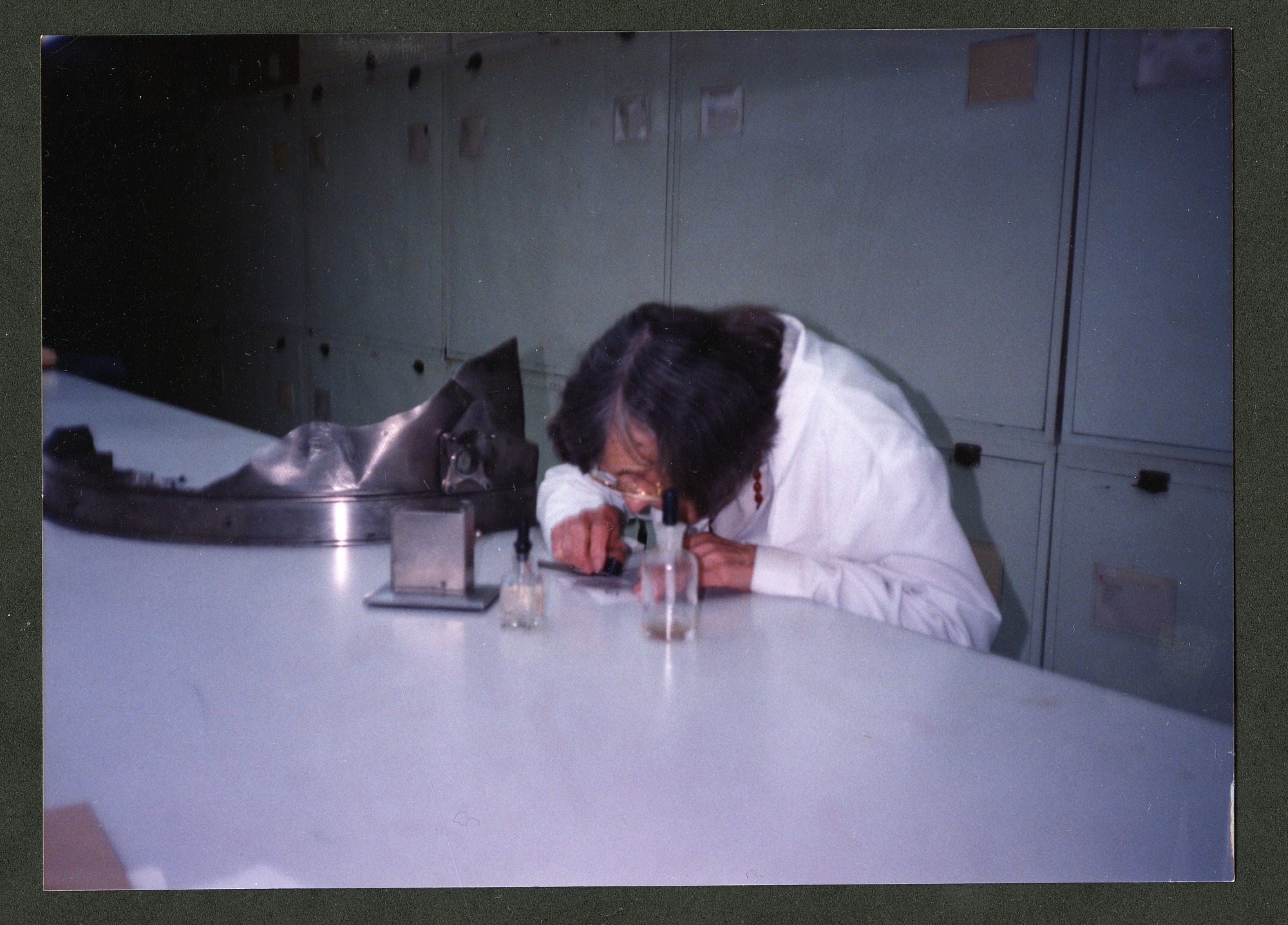Roxie Laybourne was an American ornithologist known for her ability to identify species of birds involved in bird strikes. She is pictured bent over at a counter in the Bird Division at the National Museum of Natural History examining material from an aircraft part. There are two glass vials with rubber stoppers, a metal box, and a piece of an aircraft on the counter.