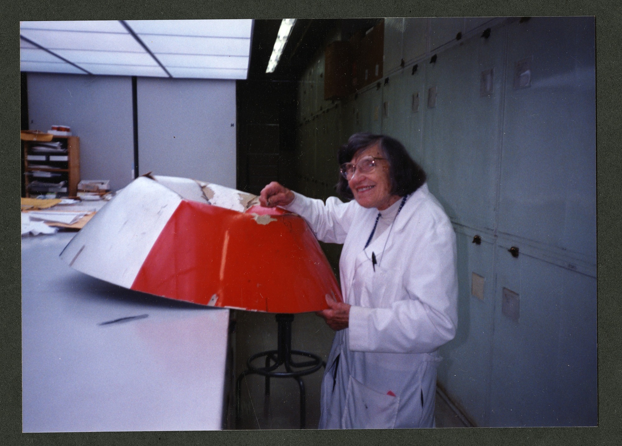 Roxie Laybourne was an American ornithologist known for her ability to identify species of birds involved in bird strikes. In the Bird Division at National Museum of Natural History, she is standing and grinning at the camera at a counter holding a dented red and white aircraft nose cone.