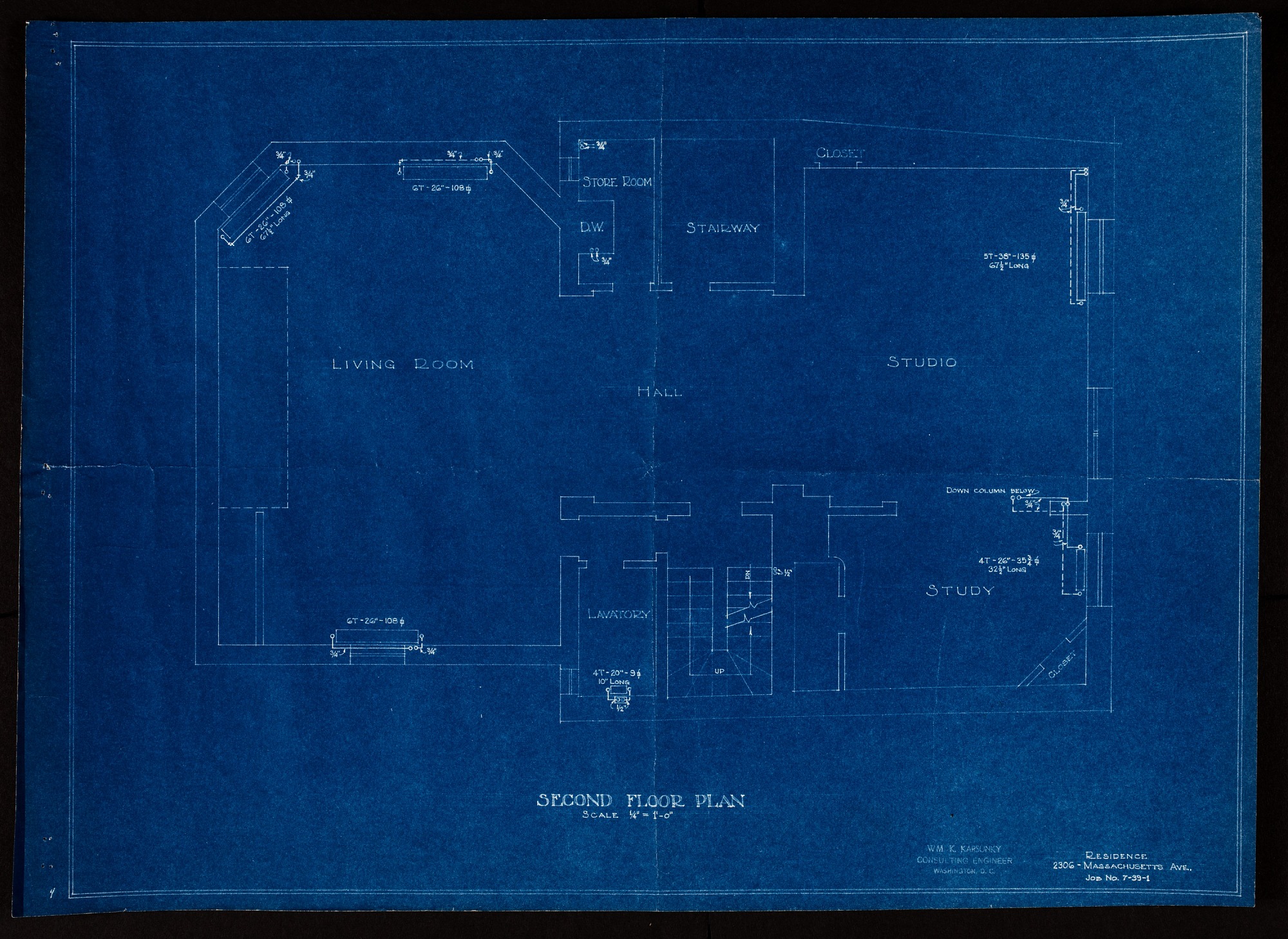 Blueprint drawing of the first floor of Alice Pike Barney's Studio House, 2306 Massachusetts Avenue NW. William K. Karsunky was the Consulting Engineer.