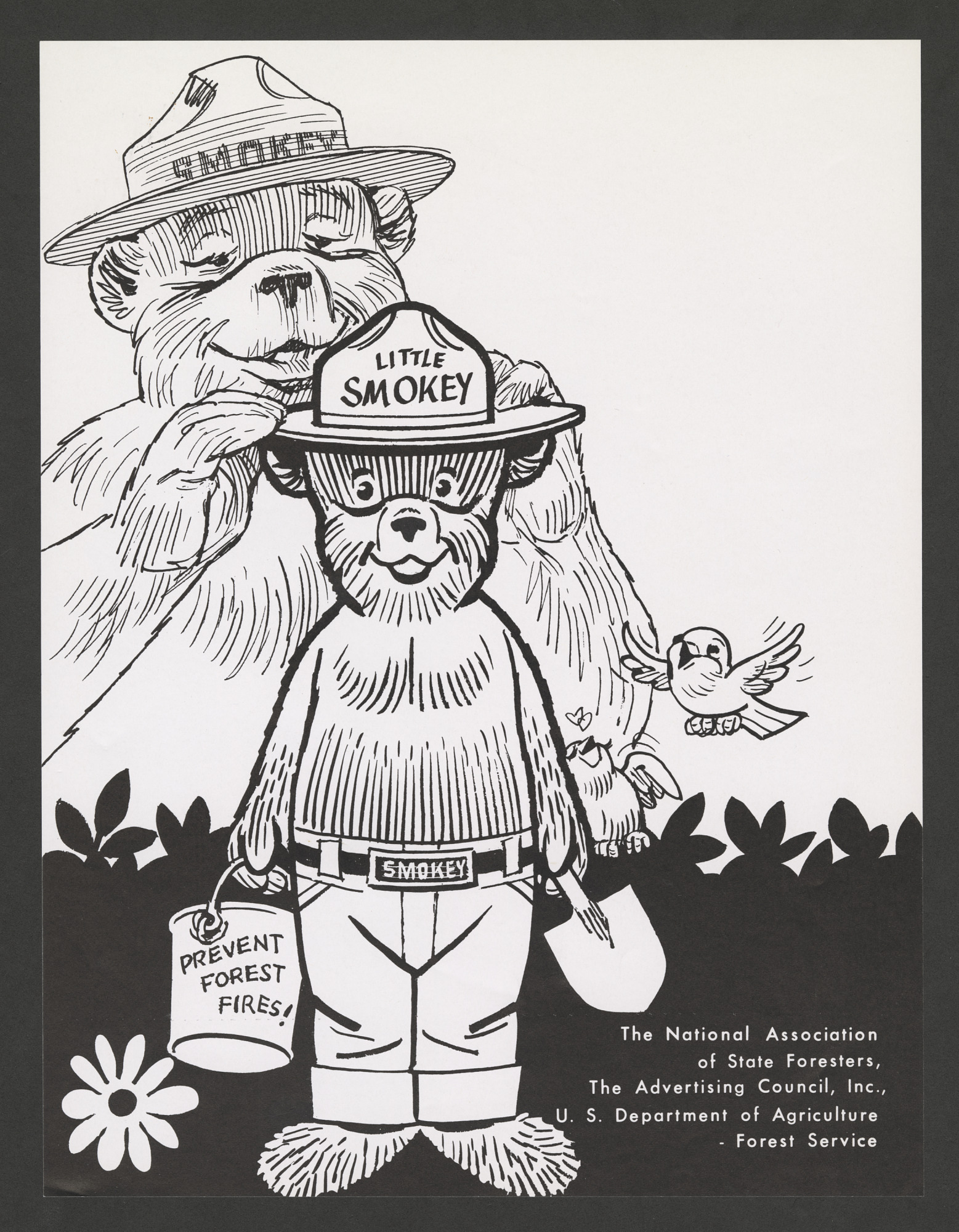 A black and white cartoon print of Smokey Bear placing a Forest Service hat on Little Smokey. Little Smokey holds a bucket that says "PREVENT FOREST FIRES!" and a spade. Two singing birds are pictured next to Little Smokey.